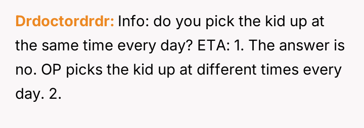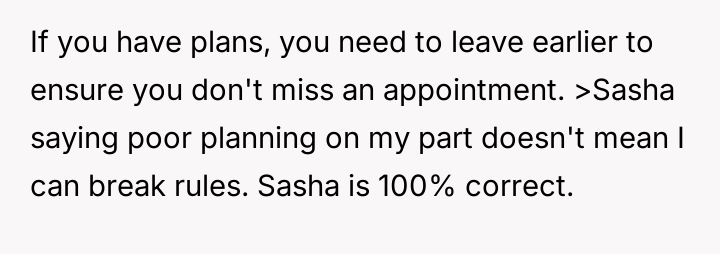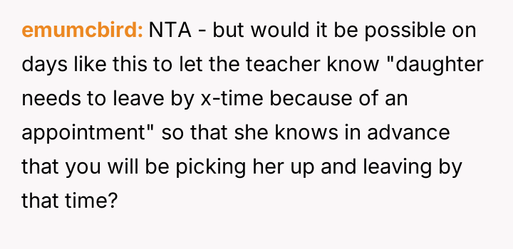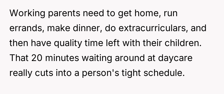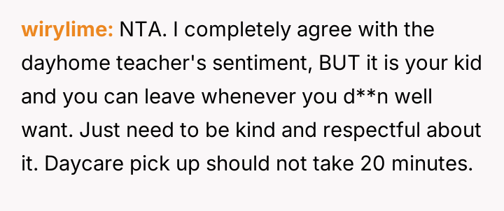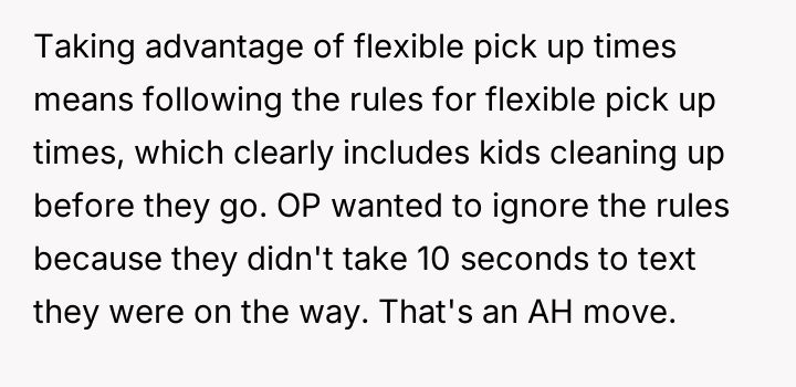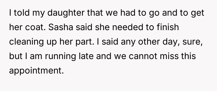 The original poster (OP) prioritized an urgent schedule and an existing appointment over the daycare teacher's insistence on the child completing a cleanup task.
