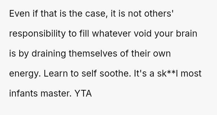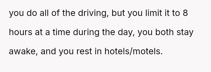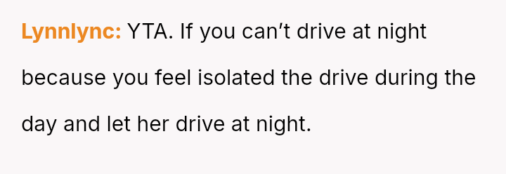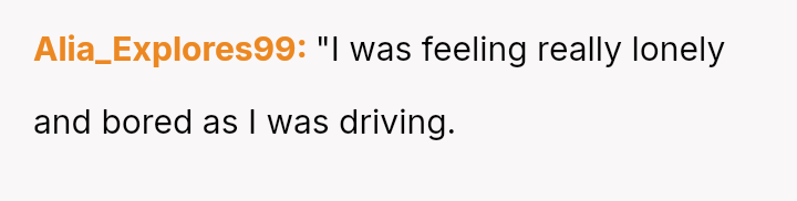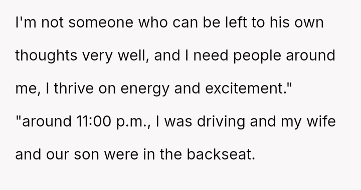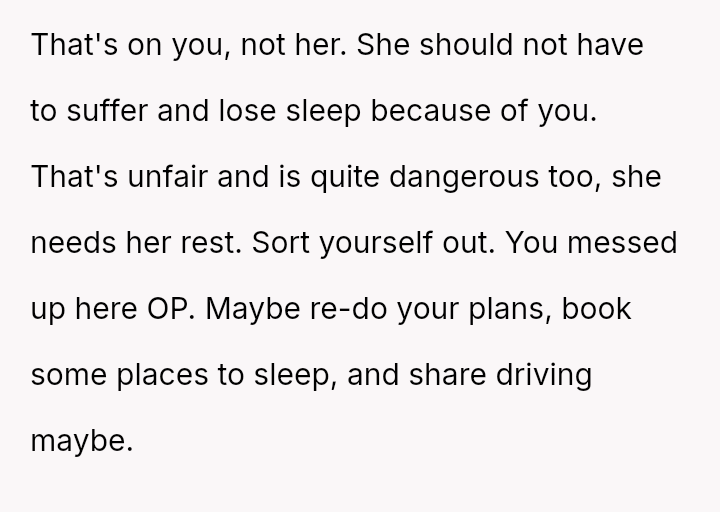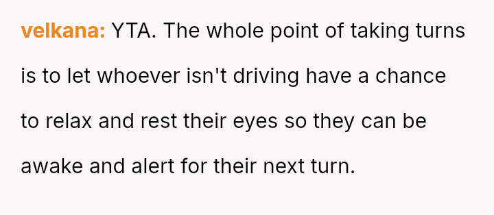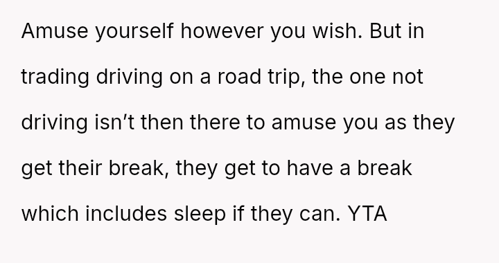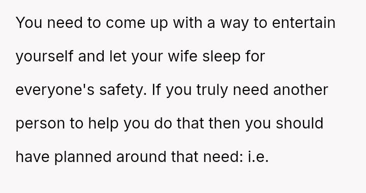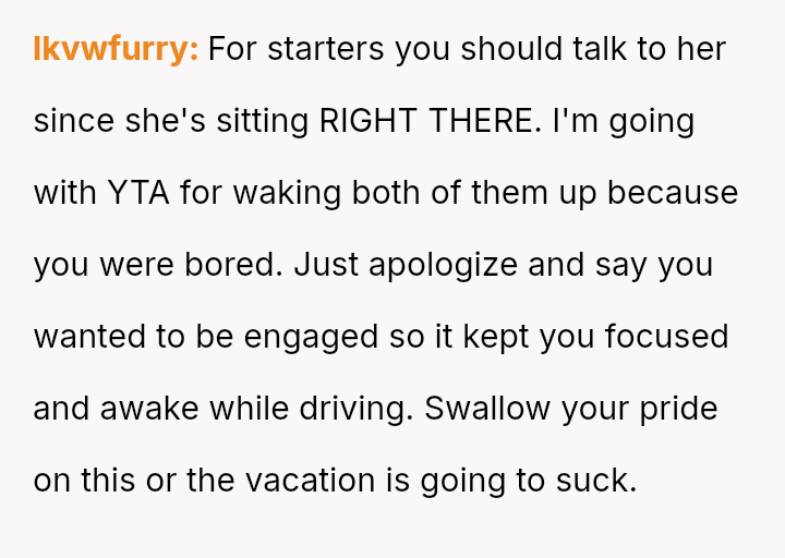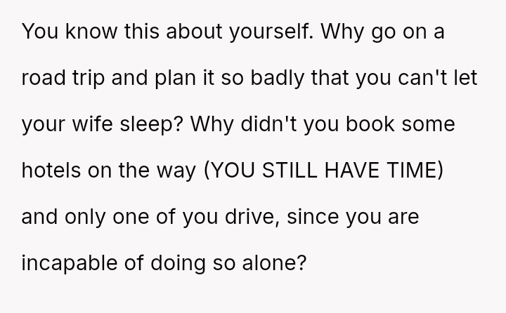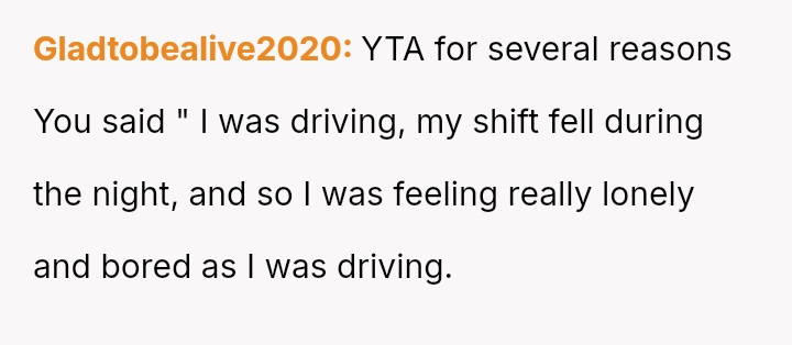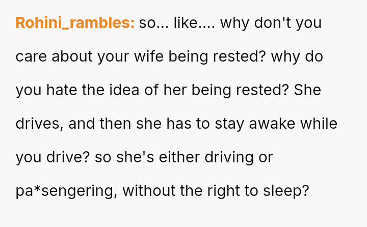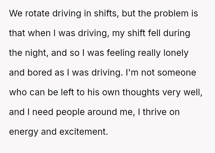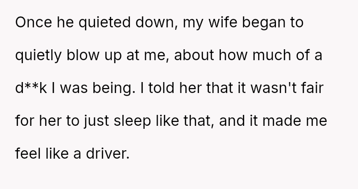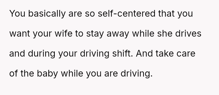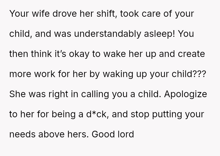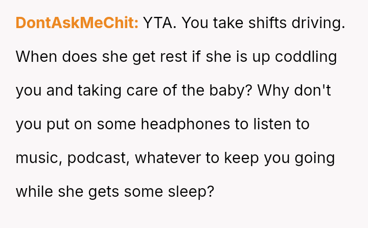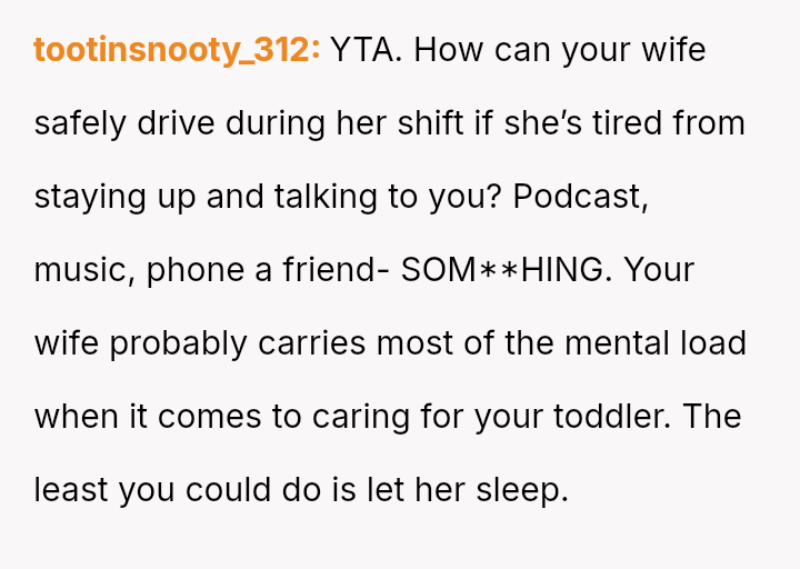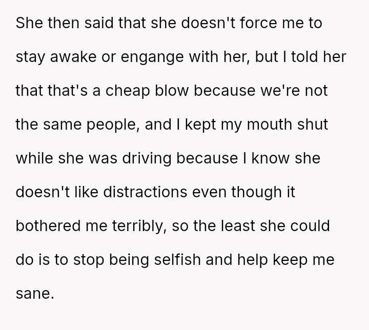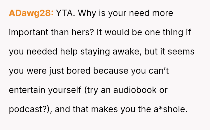The original poster feels emotionally unsupported during a late-night driving shift, believing their need for interaction justifies waking their sleeping wife.