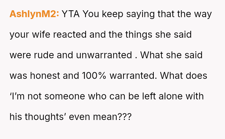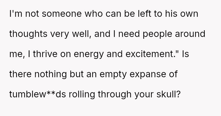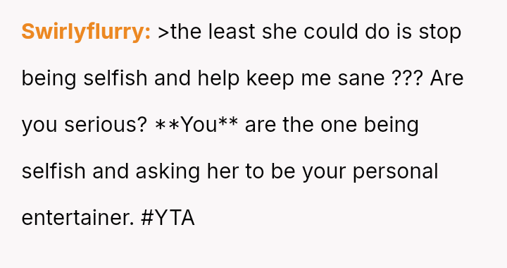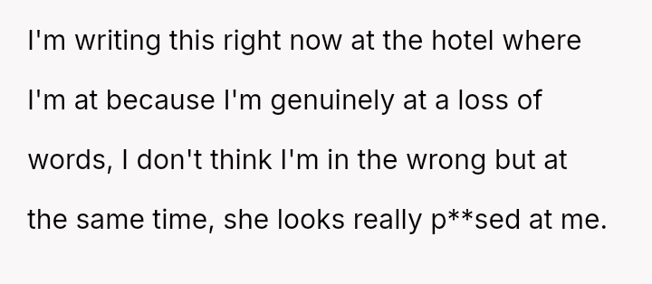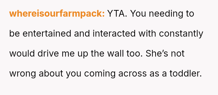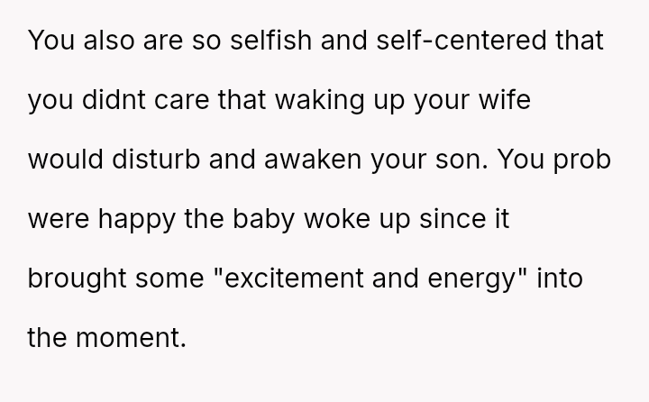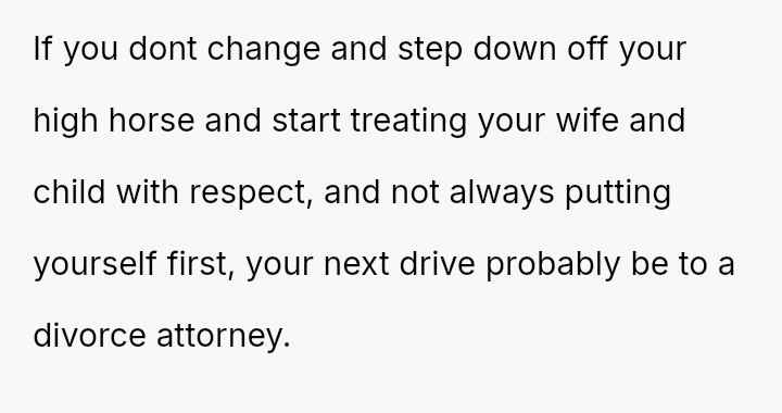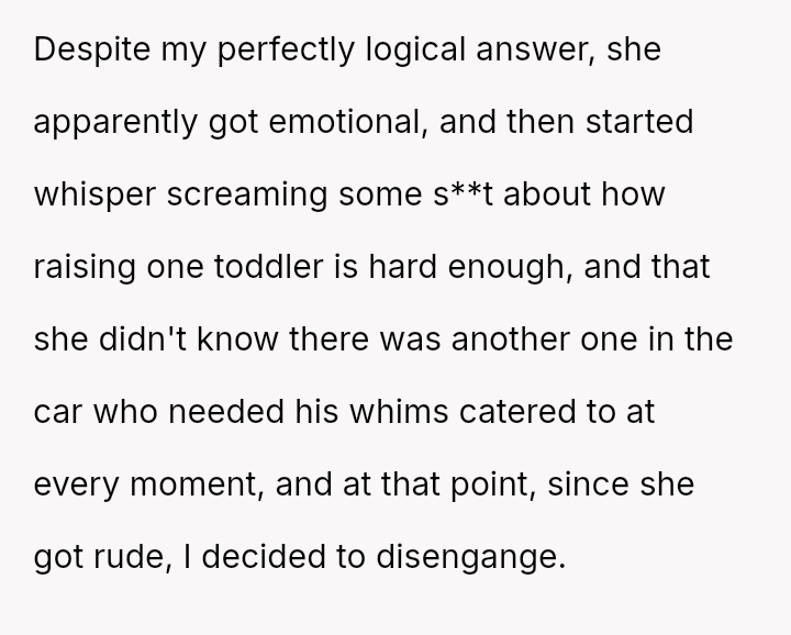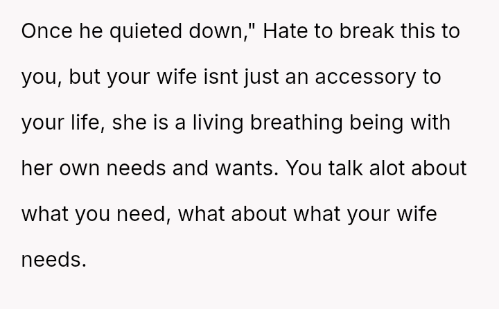 This action directly clashed with the wife's expectation of uninterrupted rest, especially while caring for a toddler, leading to an intense argument where both parties felt unheard and unfairly treated regarding their differing needs for solitude versus company.