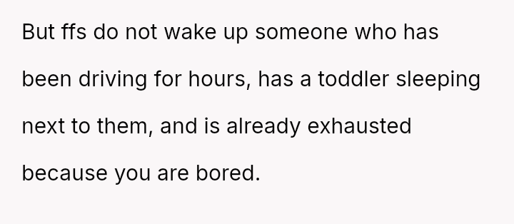 Considering the necessity of shared responsibility on a long trip, was the husband justified in prioritizing his immediate need for engagement by waking his wife and son, or should he have found a solitary way to manage his boredom, recognizing his wife's equal need for rest?