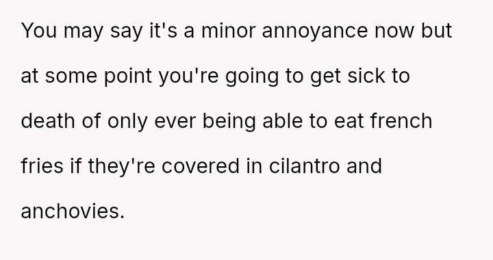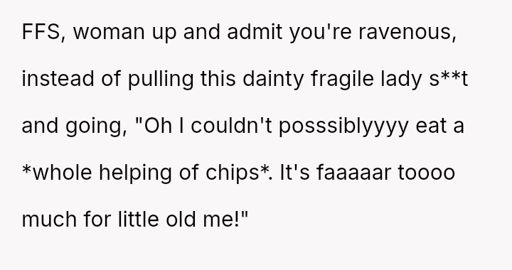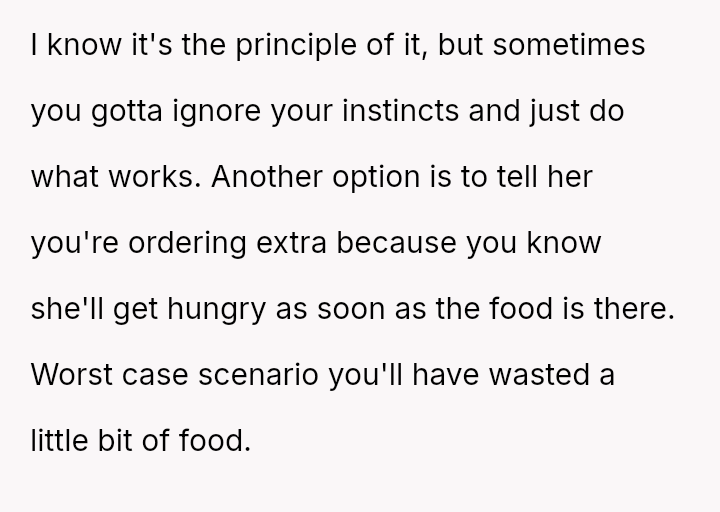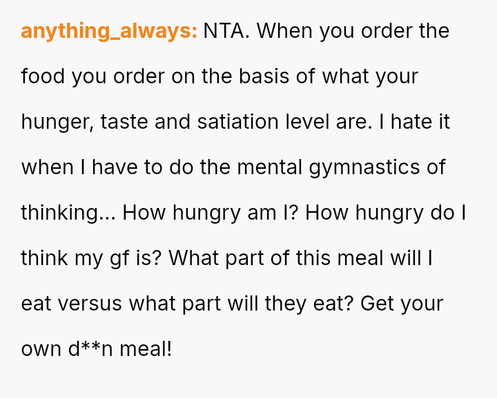 The core question remains whether protecting one's own defined portion const*tutes selfishness, or if the wife’s inability to order for herself and subsequent manipulative sadness const*tutes an unfair burden on the OP.