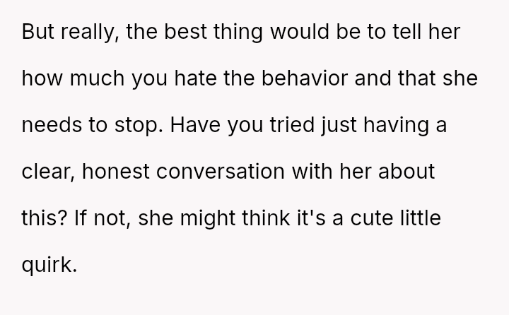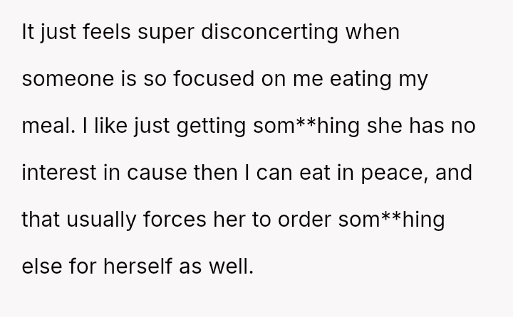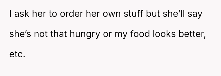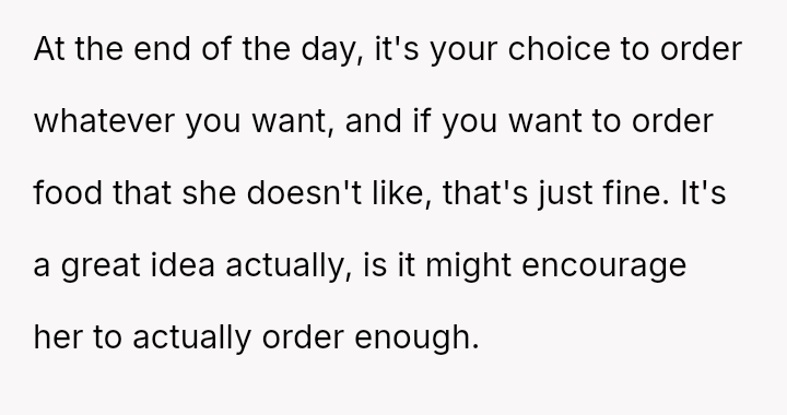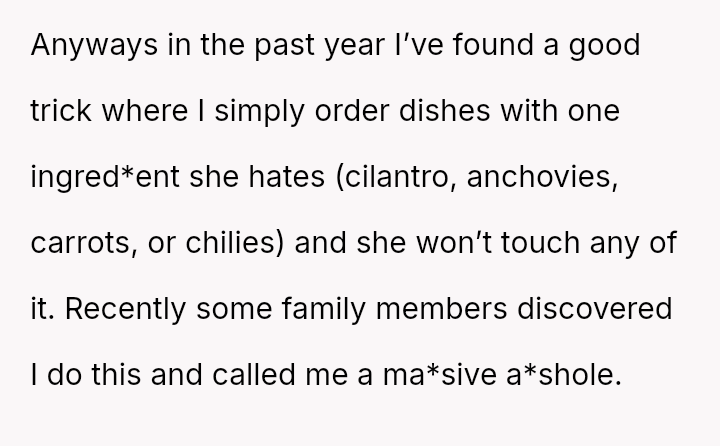 The OP's current strategy—ordering food with ingred*ents their spouse dislikes—is an avoidance tactic designed to maintain peace and ensure they can finish their meal without confrontation or guilt-inducing behavior from their wife.
