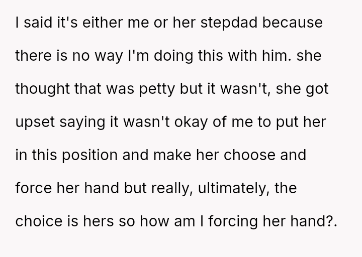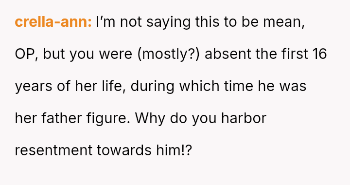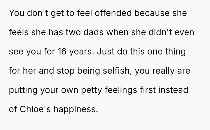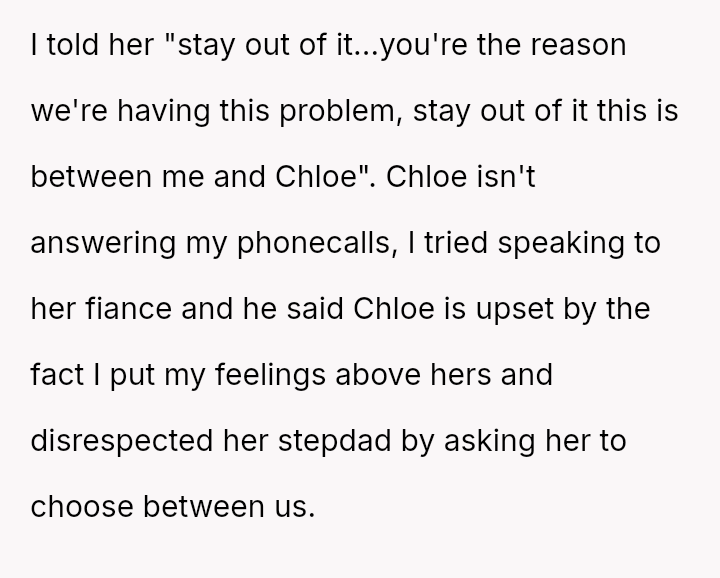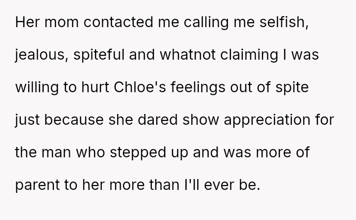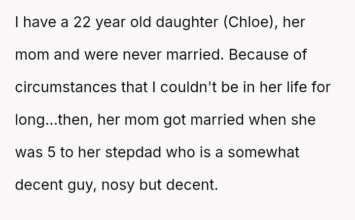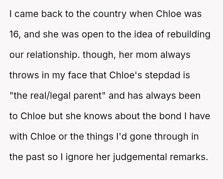 The original poster (OP) is facing a significant emotional conflict stemming from their complex history with their daughter, Chloe, and her relationship with her stepfather.