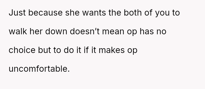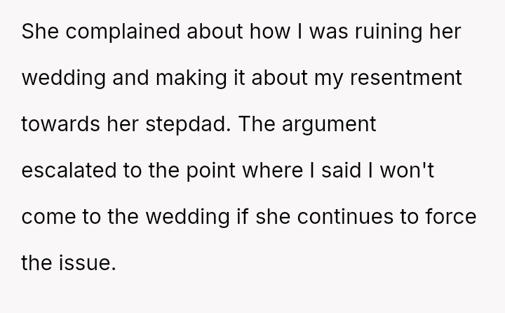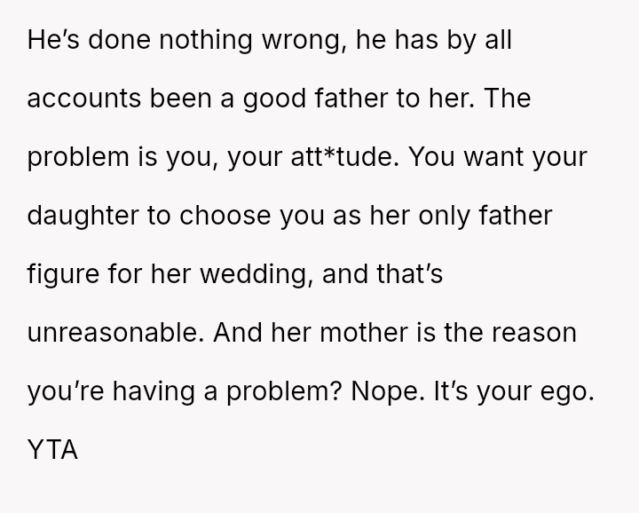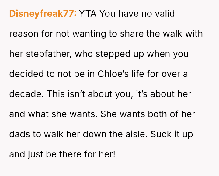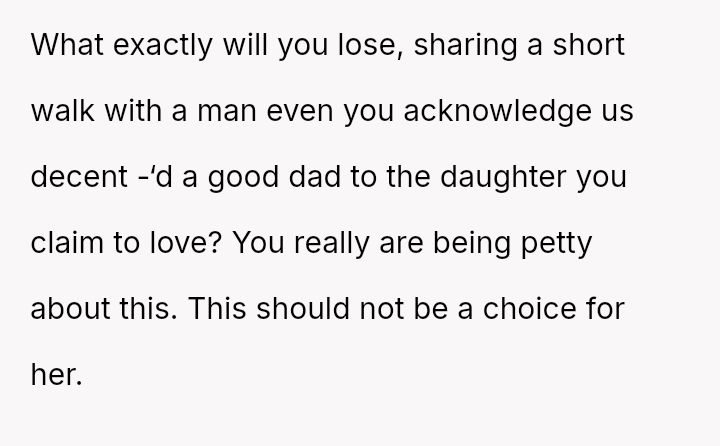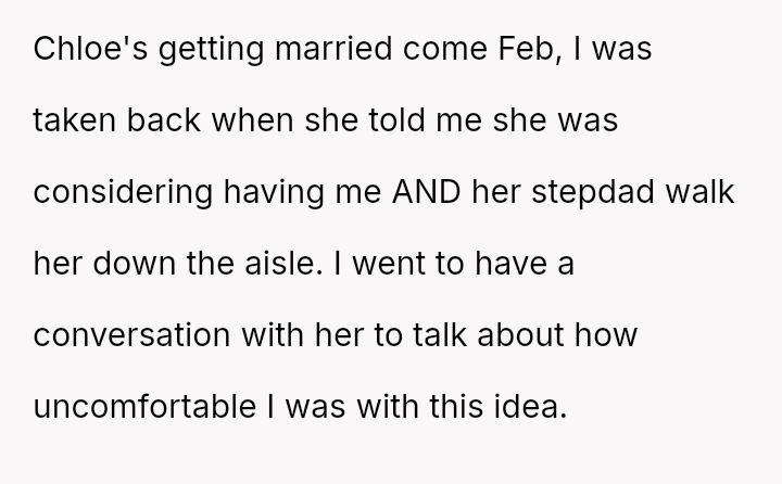 The OP's inability to accept the stepfather sharing the role of walking Chloe down the aisle has led to an ultimatum, causing Chloe to feel pressured and angry, and resulting in a breakdown of communication between father and daughter.