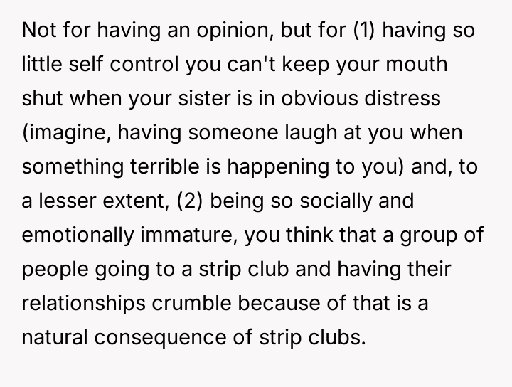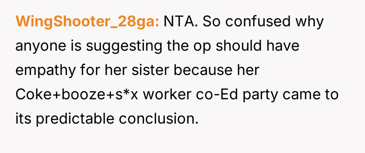 The central conflict lies between the OP's belief that the chaotic results were entirely predictable given the choices made (alcohol, substances, strip clubs) and the sister's expectation that the OP should offer sympathy instead of perceived judgment.