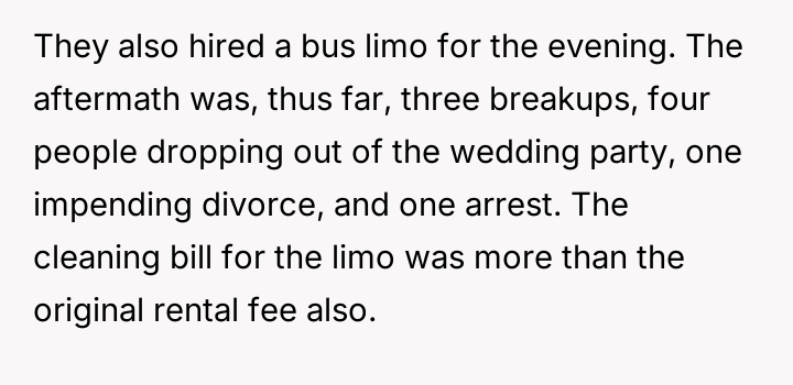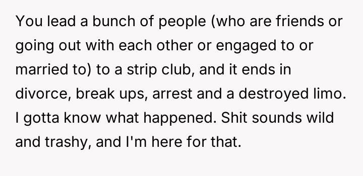 A joint bachelor/bachelorette party, intended to unite and excite, instead ignited a wildfire of heartbreak—three broken relationships, friends abandoning roles, a looming divorce, and even an arrest.