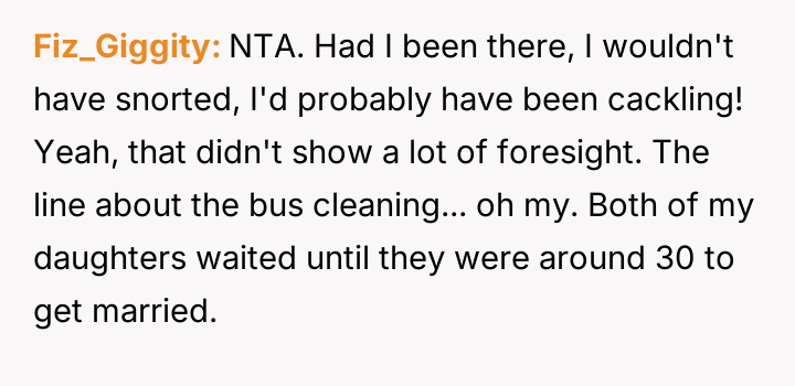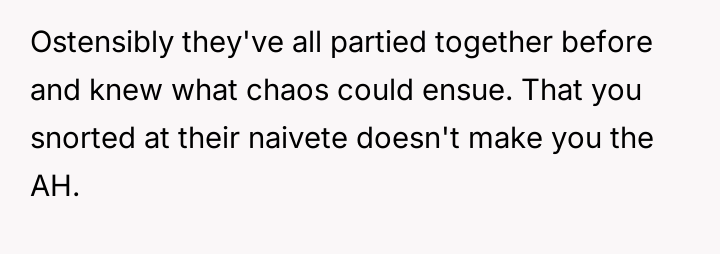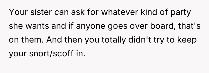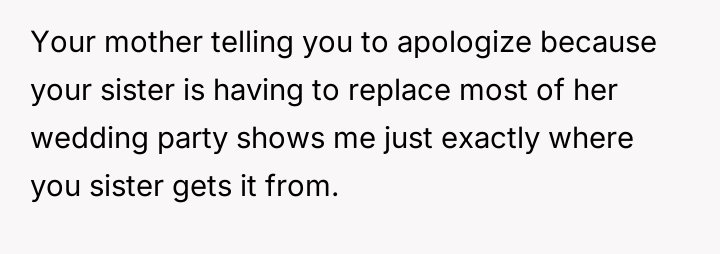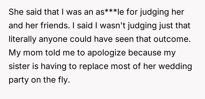 The Original Poster (OP) expressed amusement and a sense of vindication regarding the disastrous outcome of their sister's joint bachelor/bachelorette party, despite being pressured by their mother to apologize for their reaction.