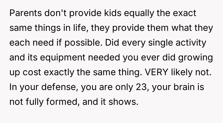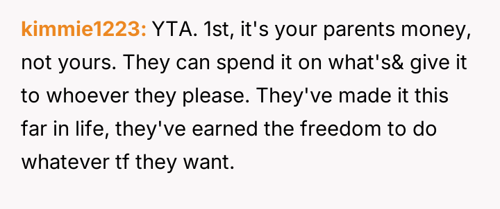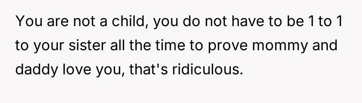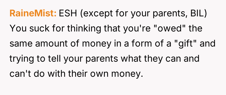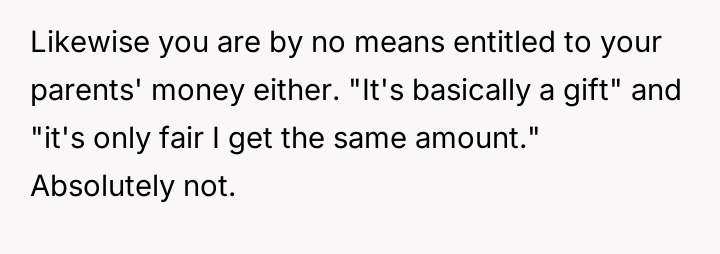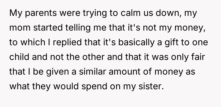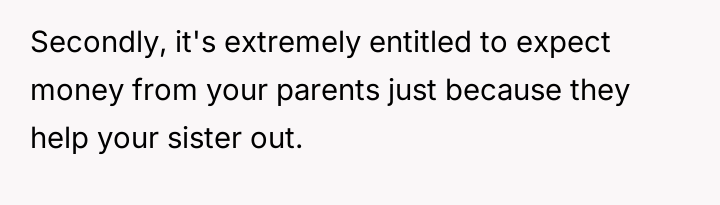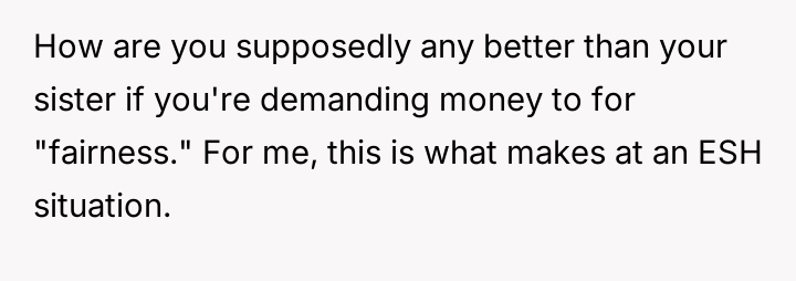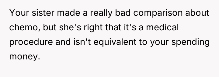 The central friction lies between the OP's belief in financial fairness, demanding equal consideration for any parental gifts, and the sister's perceived right to support for a serious medical struggle, viewing the requested funds as necessary treatment rather than a discretionary gift.