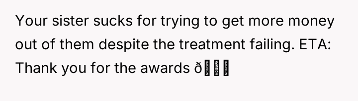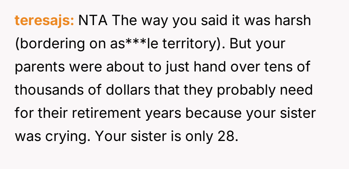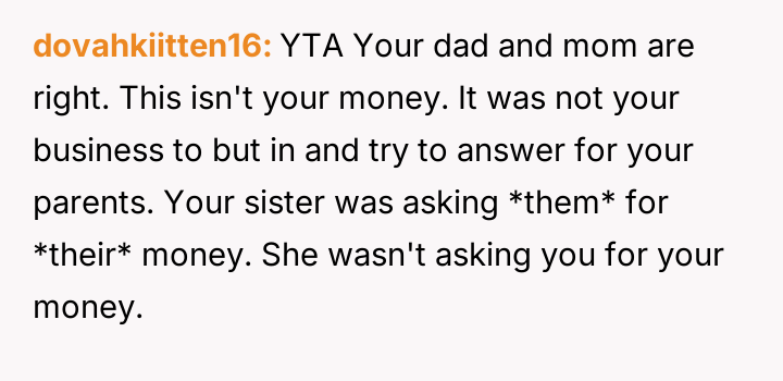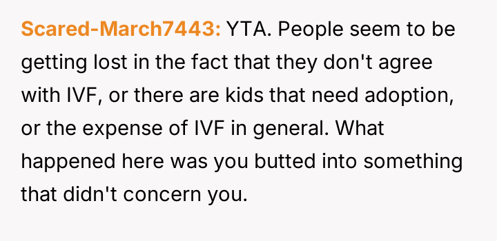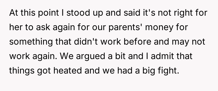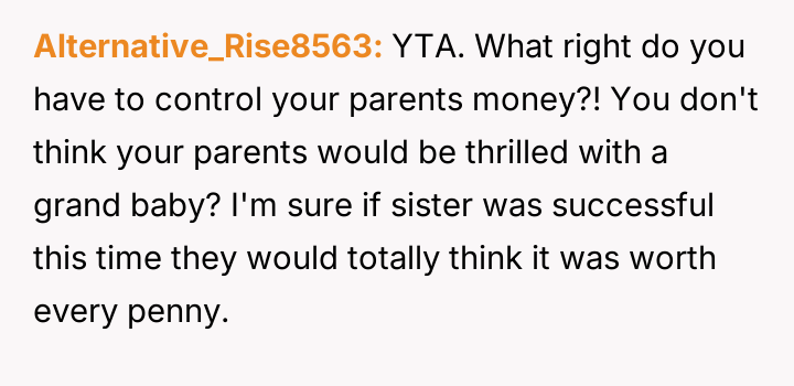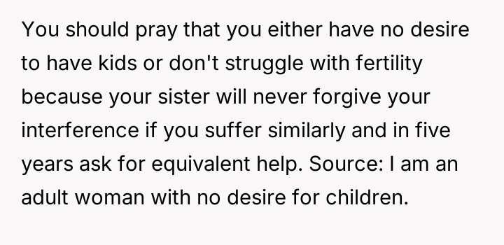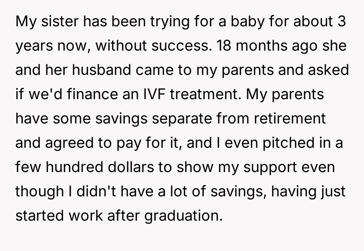 The original poster (OP) became deeply involved in their sister's financial decisions regarding fertility treatments, leading to a severe family conflict.