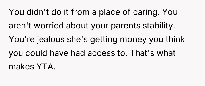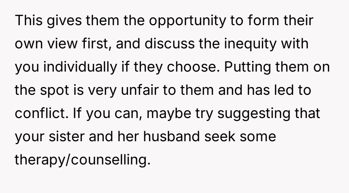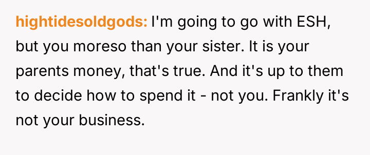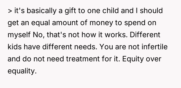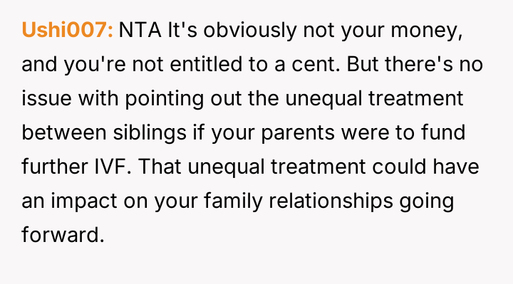 Given the clash between financial equality and compassionate support for a major life goal, the core question remains: Is the OP justified in intervening based on principles of fairness regarding parental assets, or does the emotional and medical nature of the sister's fertility struggle warrant overriding financial considerations, making the OP's intervention unwarranted interference?
