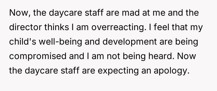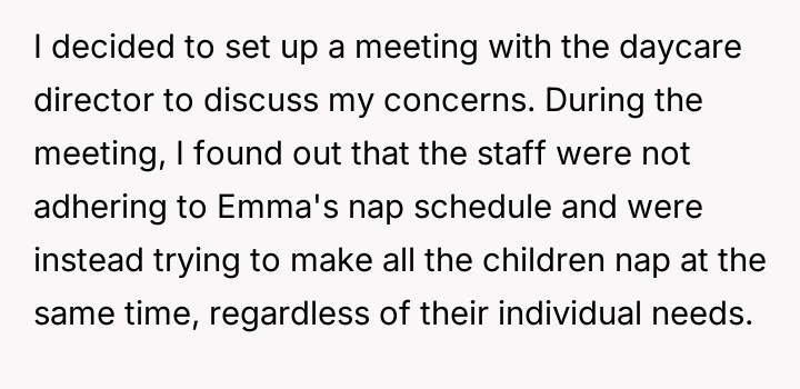 The daycare, once a place of trust, had become a battleground where the child's individual needs were overlooked in favor of convenience. Confronting the daycare director was an act of courage born from love and determination, but it came at a cost.