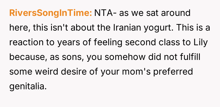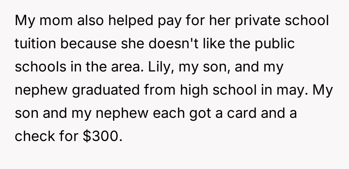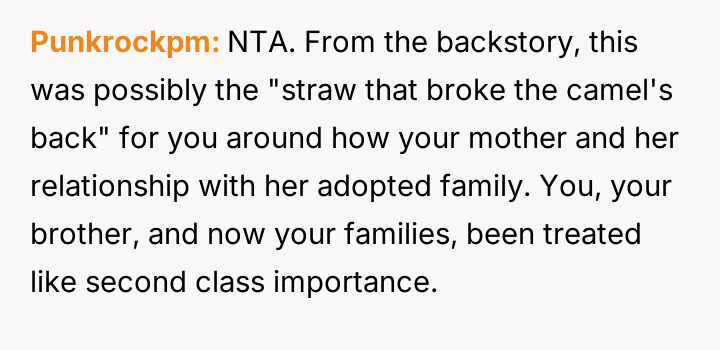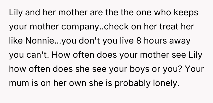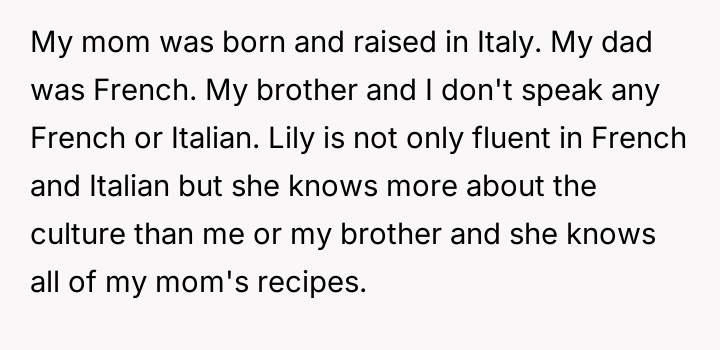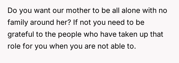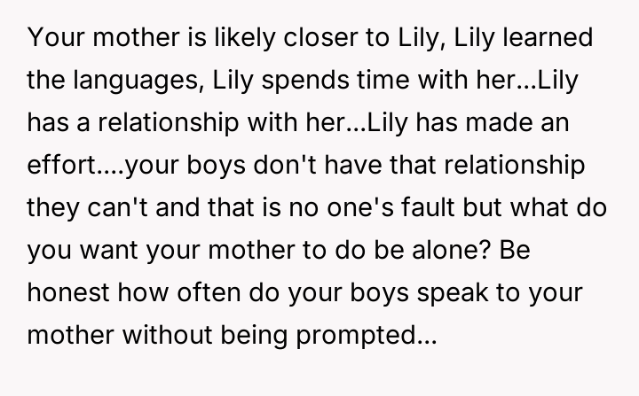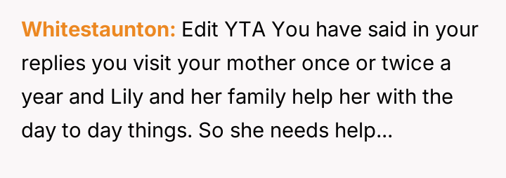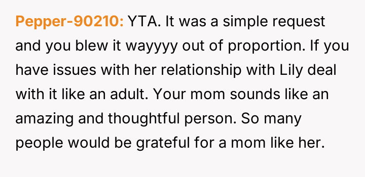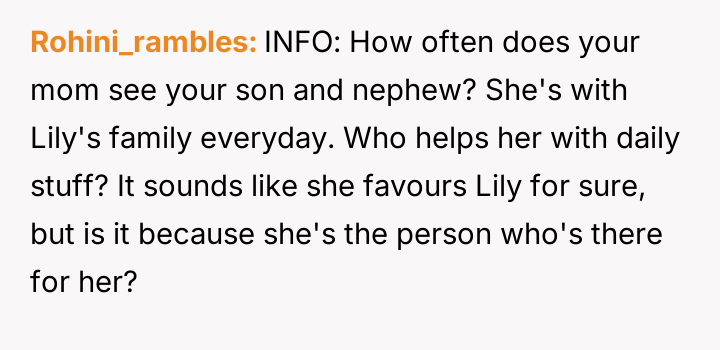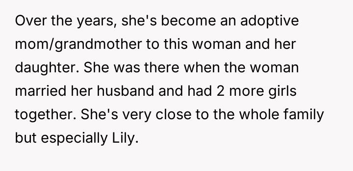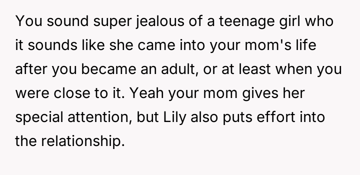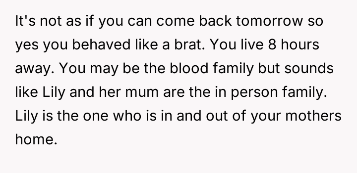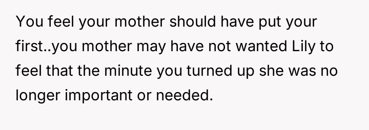 The OP felt disrespected by this demand, especially considering the significant emotional and financial investment their mother has made in Lily over the years, leading the OP to abruptly leave.