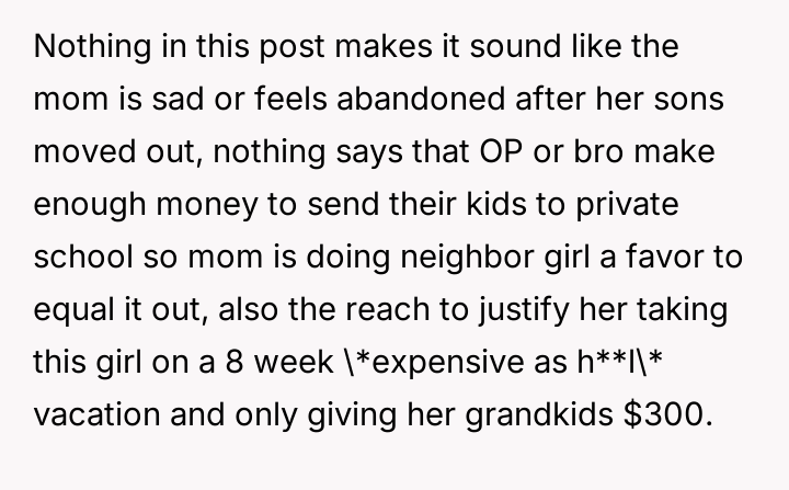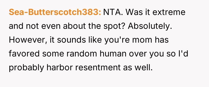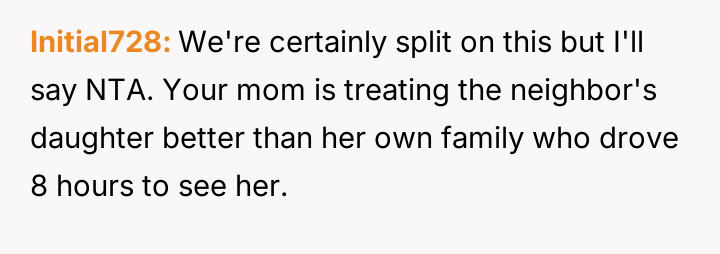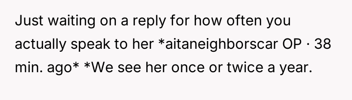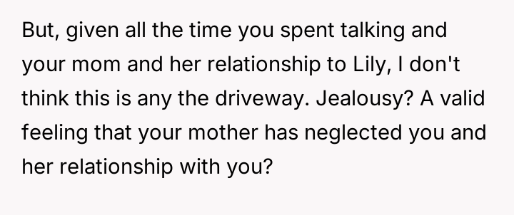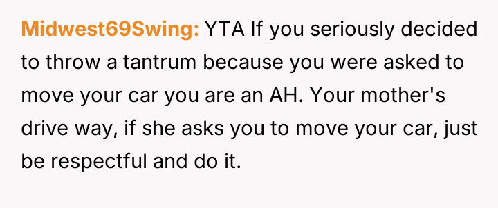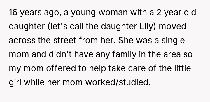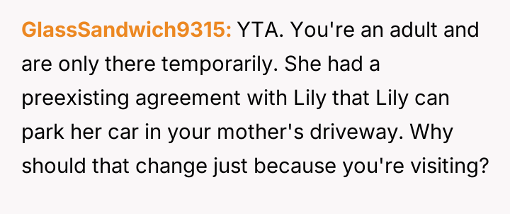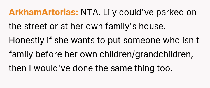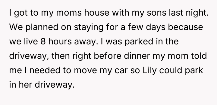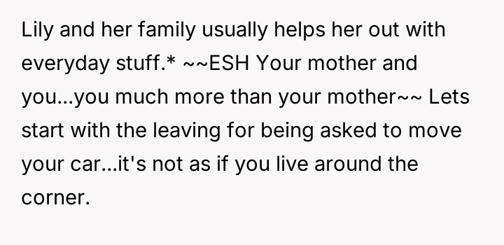 The original poster (OP) experienced a moment of conflict when their mother demanded they move their car to accommodate Lily, a neighbor the mother treated as family.