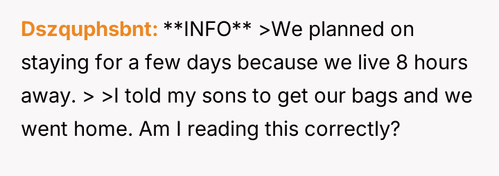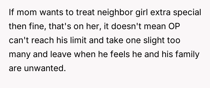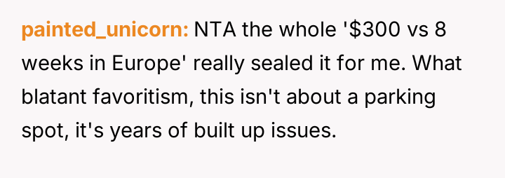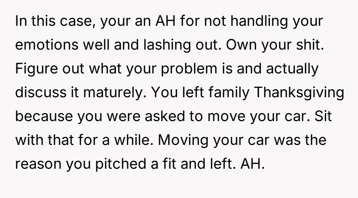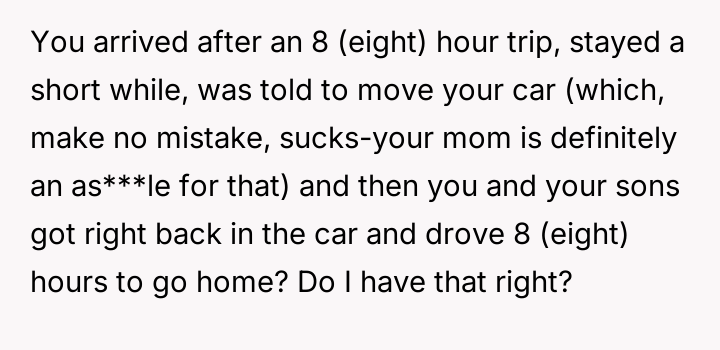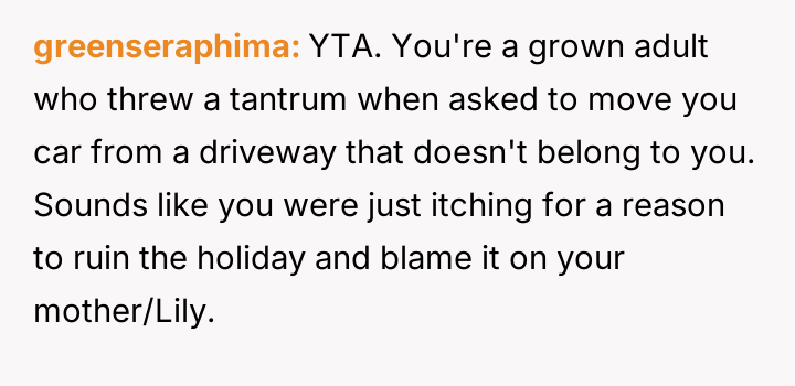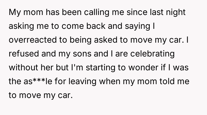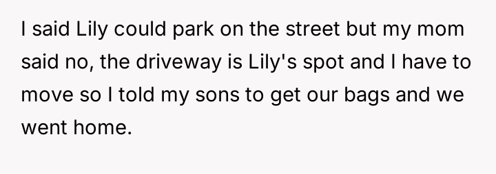 The central question is whether the OP's immediate departure, based on a single demand regarding parking, was a justified defense of respect, or an overreaction to a situation rooted in the mother's deep, established favoritism toward Lily.