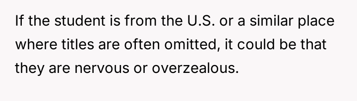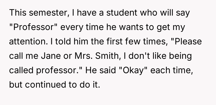 Smith") versus the student's persistent refusal to comply, choosing instead the formal title "Professor." Is the professor justified in using the impersonal term "student" as a form of pushback against repeated boundary violations, or does this tactic cross a professional line and expose the professor to undue risk?