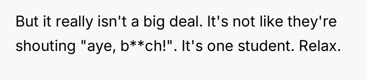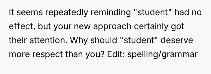 In response to his disregard, she subtly mirrors his behavior, calling him "student" instead of his name, turning the tables in a delicate dance of respect and boundaries.