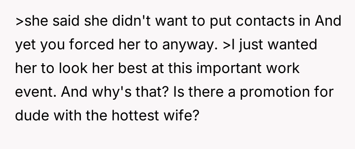 The central conflict revolves around the husband's request for his wife to wear contact lenses instead of glasses to a formal work party, which she perceived as a judgment on her appearance and a requirement for his approval.