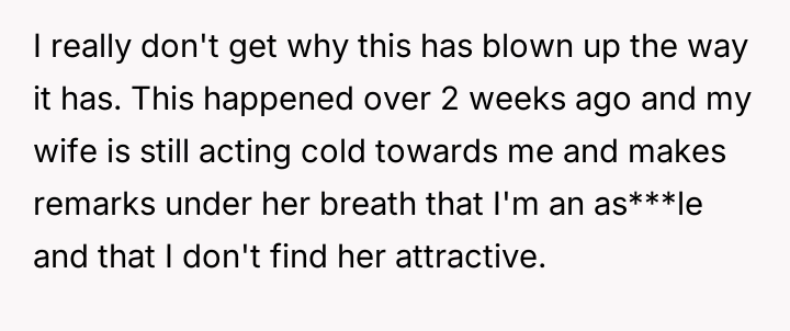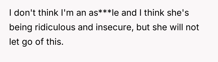 The wife is currently holding onto feelings of being controlled and unattractive, while the husband feels his request was reasonable for a special occasion and views her continued resentment as an overreaction.
