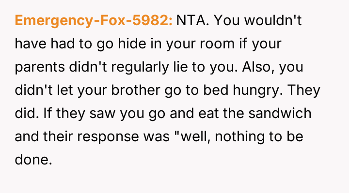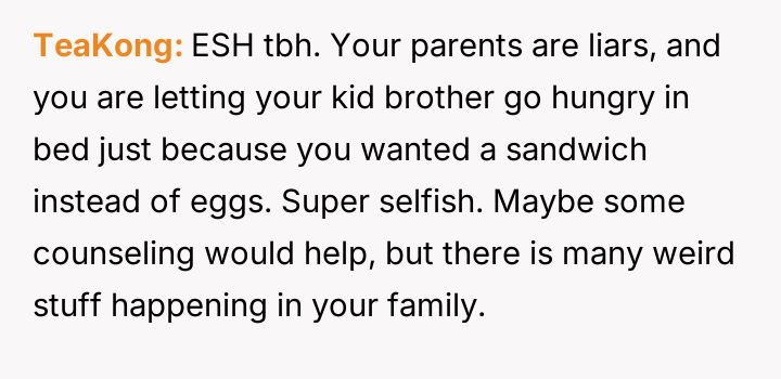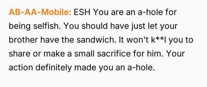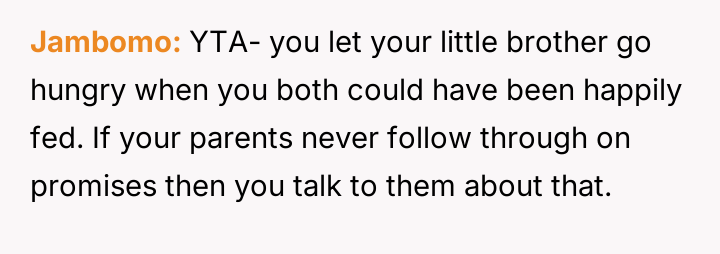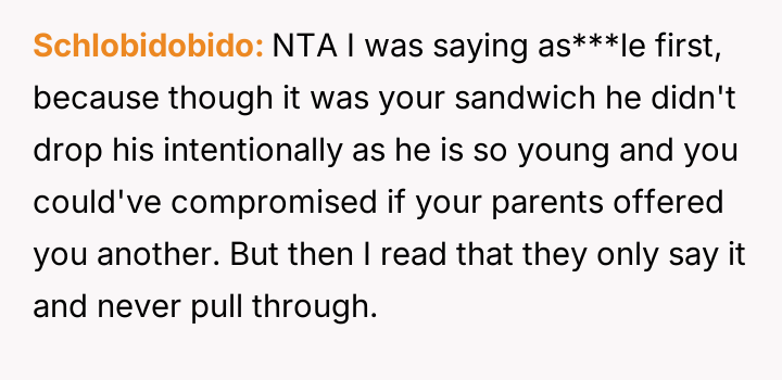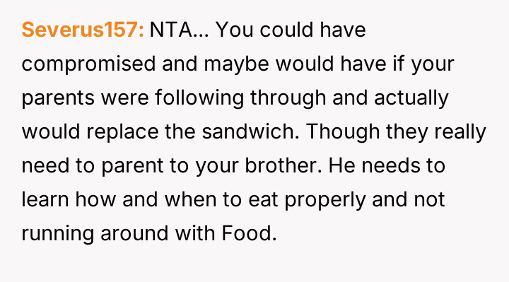 Was the OP justified in preemptively eating their sandwich based on previous broken promises, or did sacrificing their immediate need to prevent their younger brother from going hungry demonstrate a necessary familial responsibility, even if the promise of replacement was dubious?