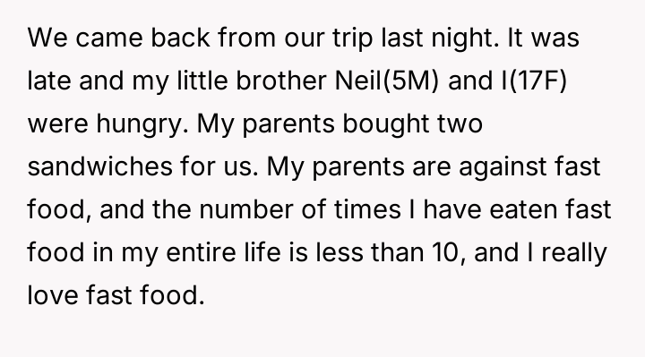 Their parents, strict about avoiding fast food, handed them two sandwiches—an unusual treat that sparked a fleeting hope in the girl's heart, knowing how rare such moments were.
