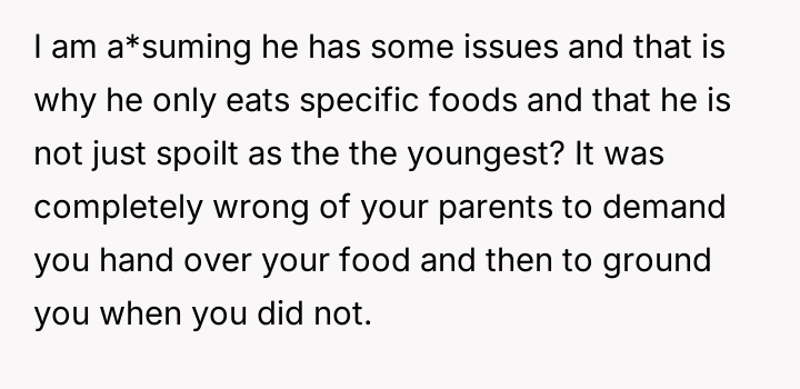 The original poster (OP) faced a conflict between their strong desire for a specific food they rarely get and their parents' demand to sacrifice their meal for their younger brother.