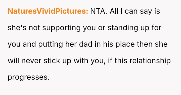 The OP is currently facing significant relationship stress because his need for respect clashed directly with his girlfriend's apparent desire to maintain peace by ignoring her father's inappropriate behavior.