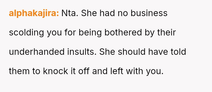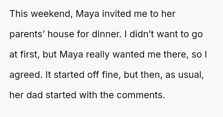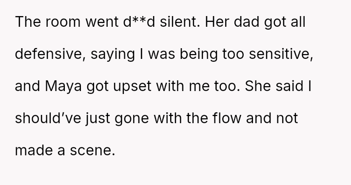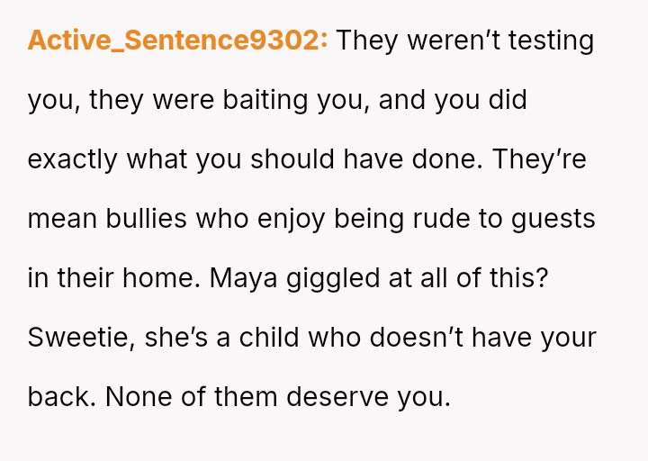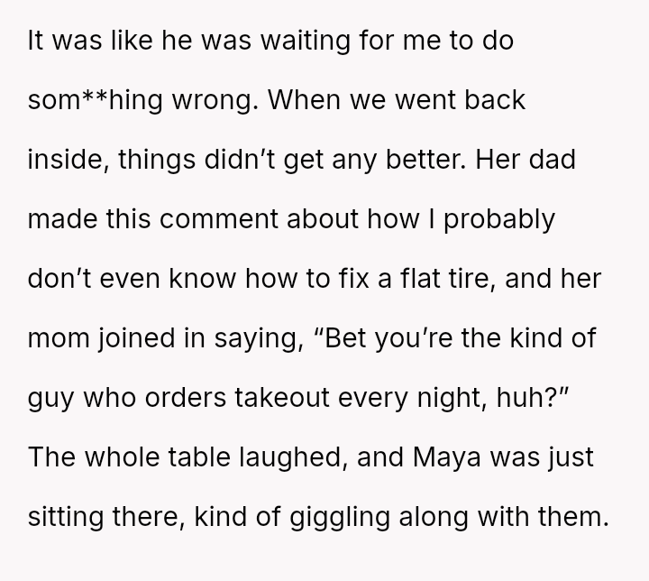 After further teasing from both parents and observing Maya seemingly join in the ridicule, the OP confronted the father and abruptly left the gathering.