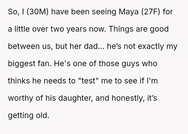 The central issue in the relationship involves Maya's father, who seems determined to challenge or test the OP's perceived worthiness.