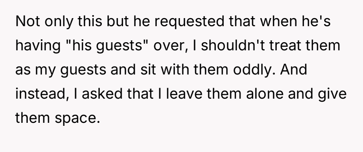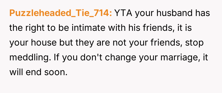 Should the wife prioritize her feeling of needing to be present as a sign of inclusion and respect for her role in their shared home, or must she respect her husband's explicit requests for designated privacy for his male friendships, even if it feels like a rejection?