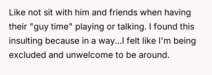 His need for "guy time" felt less like a request and more like a quiet exile, leaving her grappling with a sting of rejection and a deep yearning to belong.