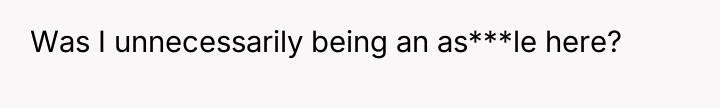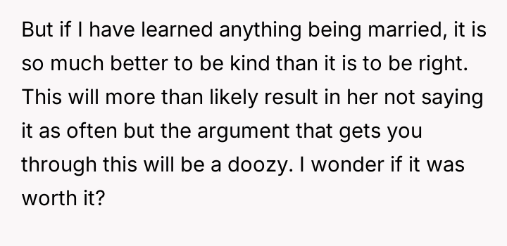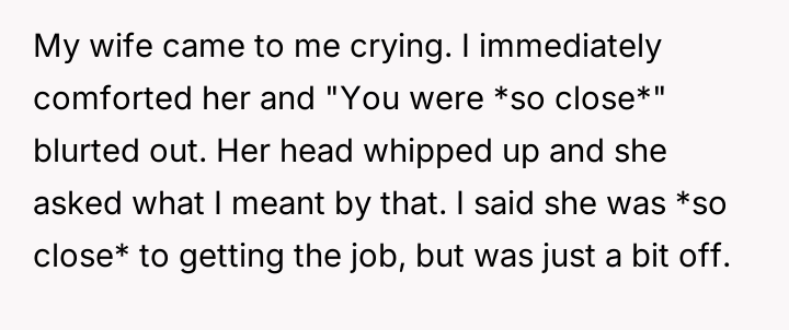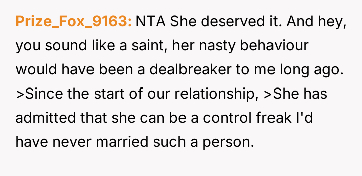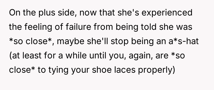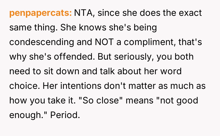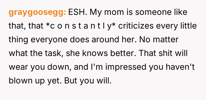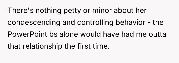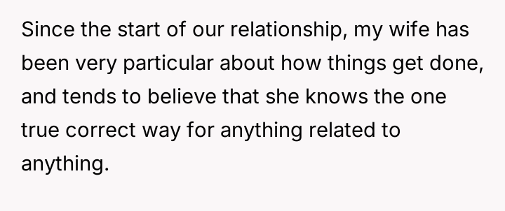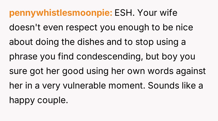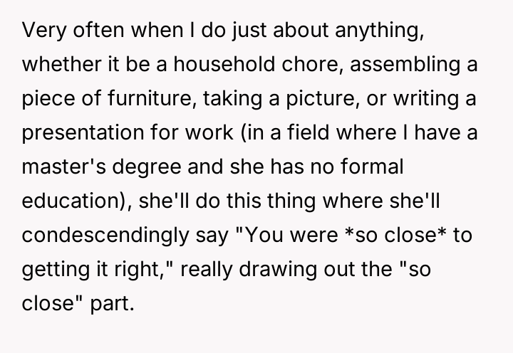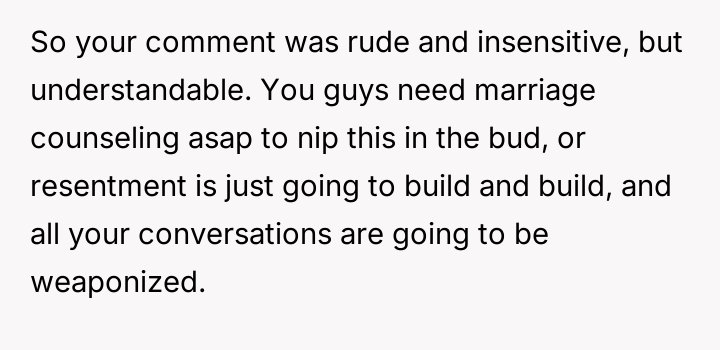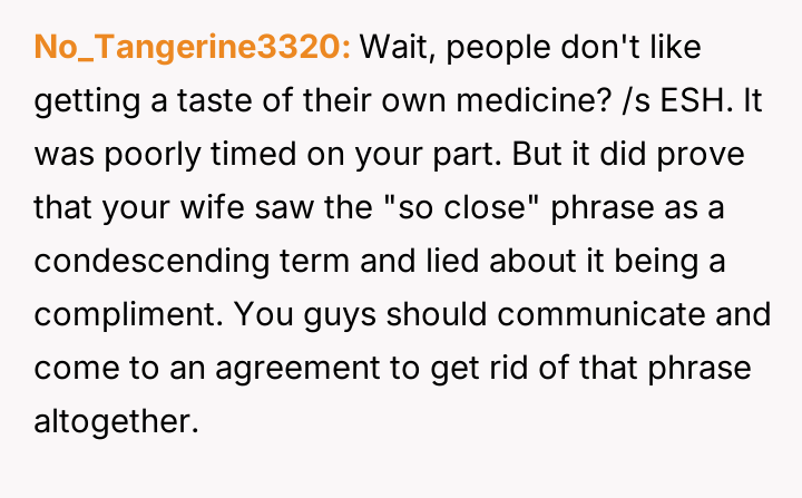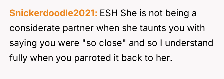 Given the established pattern of the wife’s controlling behavior and the OP's delayed reaction to voicing boundaries, is the OP's use of the phrase 'You were so close' during his wife's moment of failure a justifiable, albeit poorly timed, expression of built-up frustration, or was it an act of cruelty that warrants his self-designation as an 'asshole'?