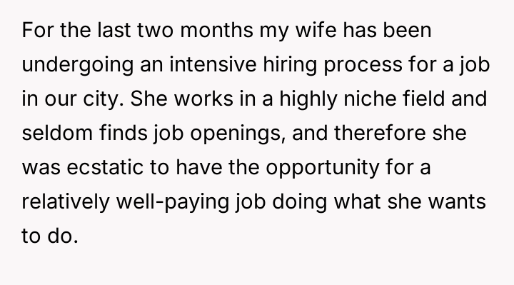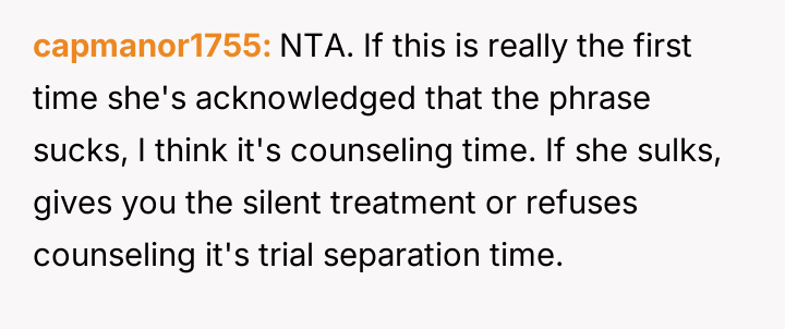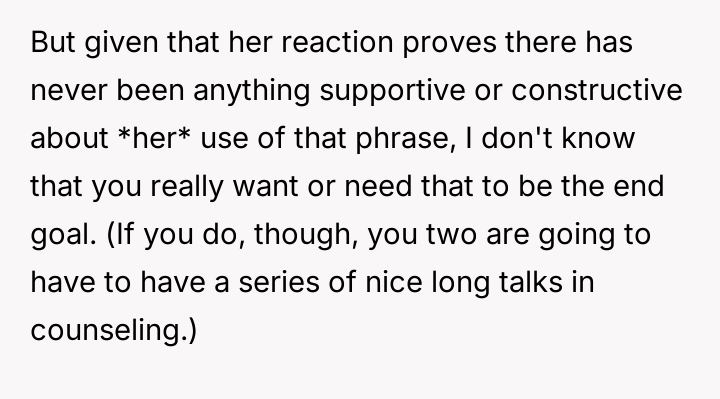 The central conflict arises when the OP inadvertently used his wife's most criticized phrase against her immediately following a major disappointment, causing her to feel deeply hurt and leading to separation.