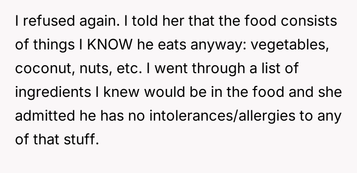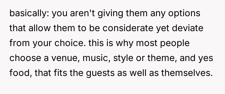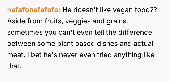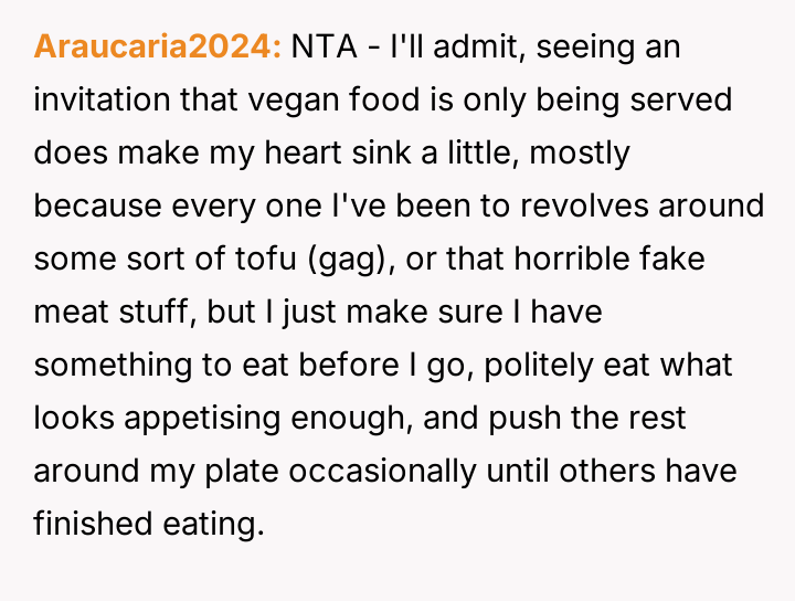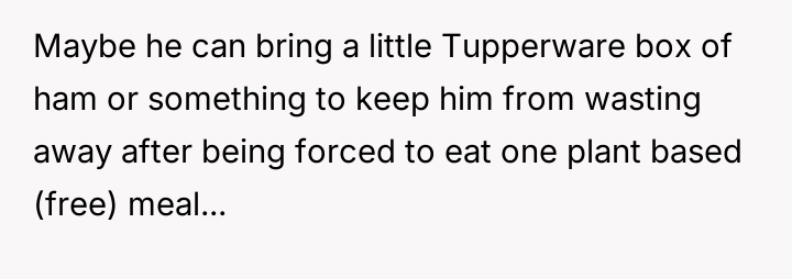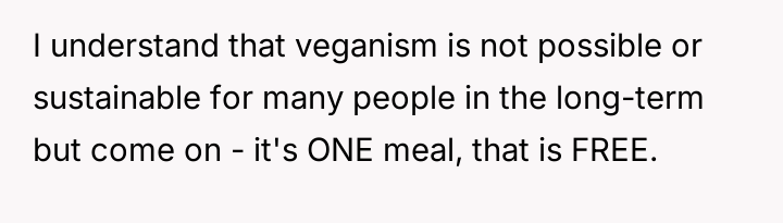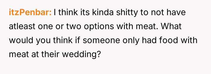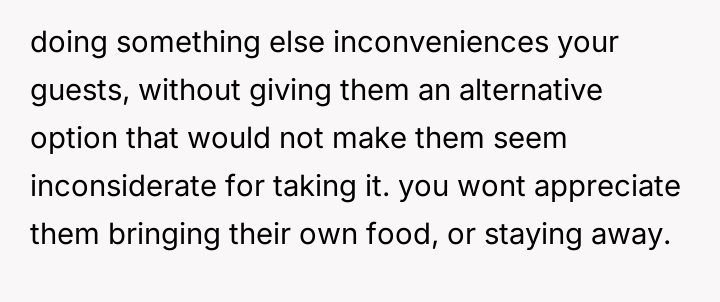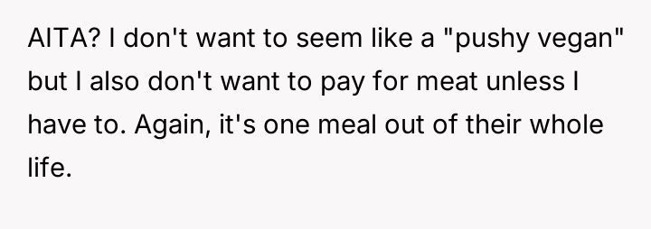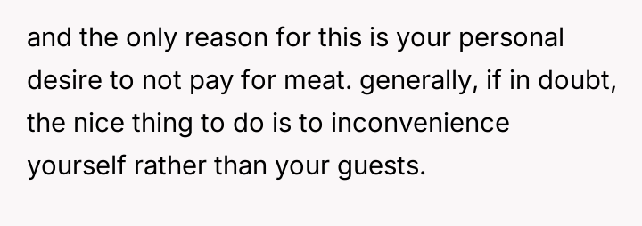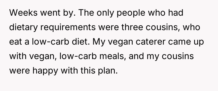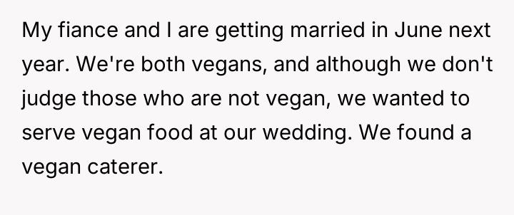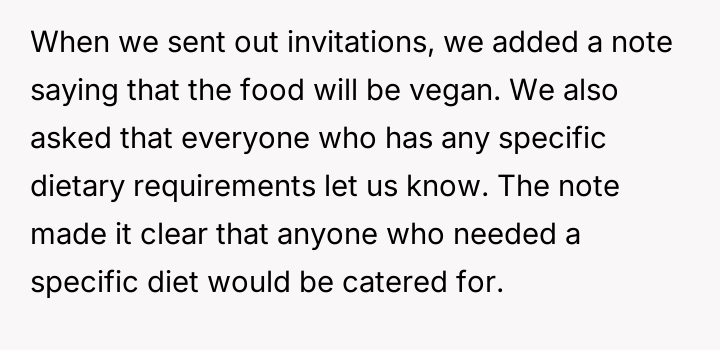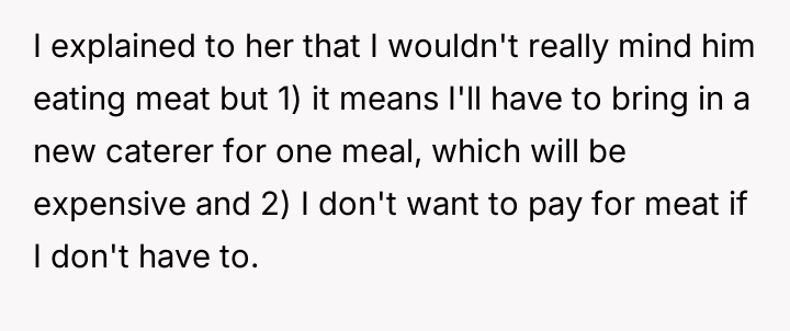 The OP is unwilling to incur extra costs or compromise the vegan theme for a guest who simply prefers meat, which has resulted in strained family relationships and potential guest cancellations.