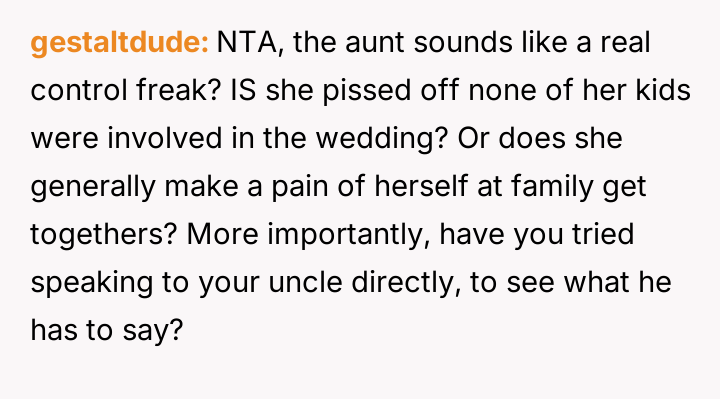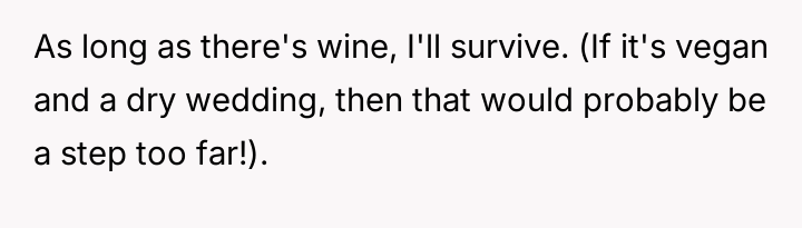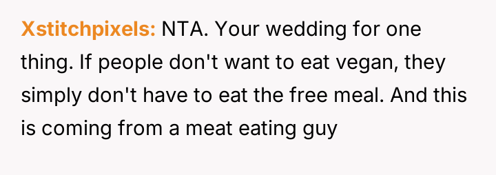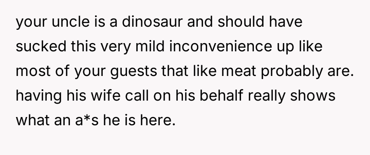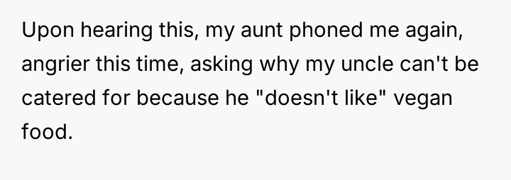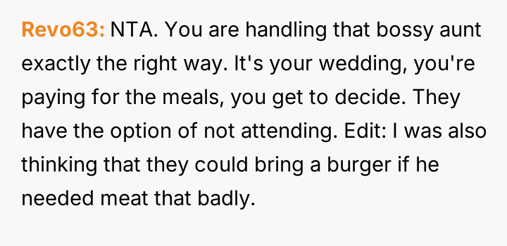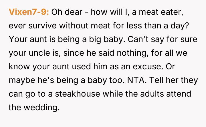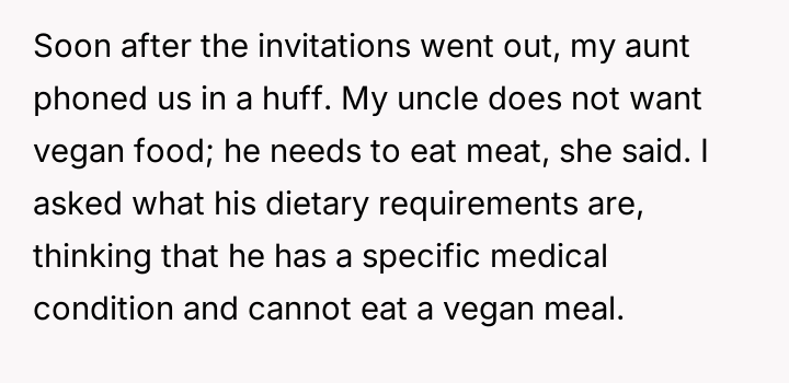The original poster (OP) feels strongly committed to their vegan principles for their wedding, leading to a significant conflict with an aunt who insists their uncle must have meat due to 'cultural' reasons, not medical necessity.