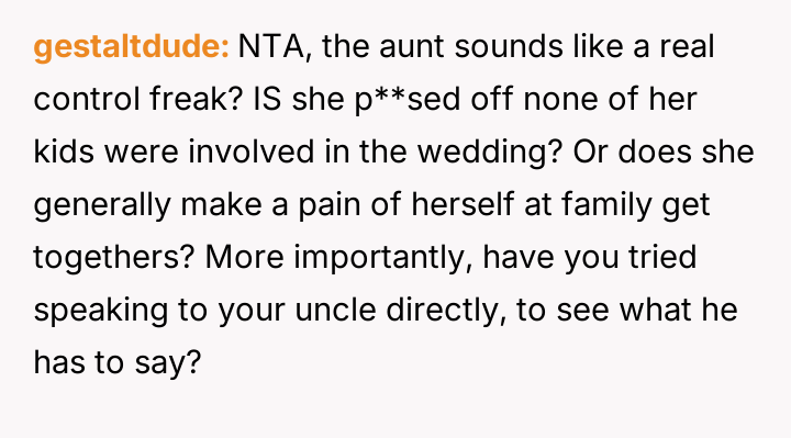 The original poster (OP) feels strongly committed to their vegan principles for their wedding, leading to a significant conflict with an aunt who insists their uncle must have meat due to 'cultural' reasons, not medical necessity.
