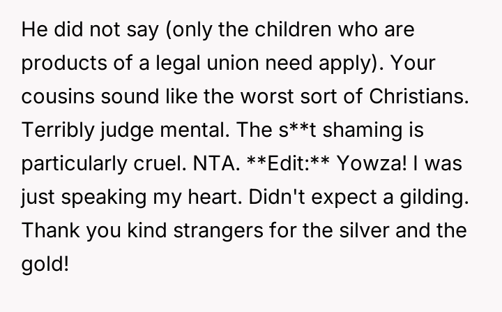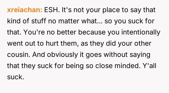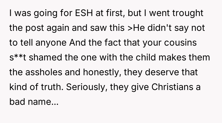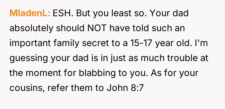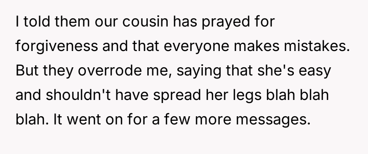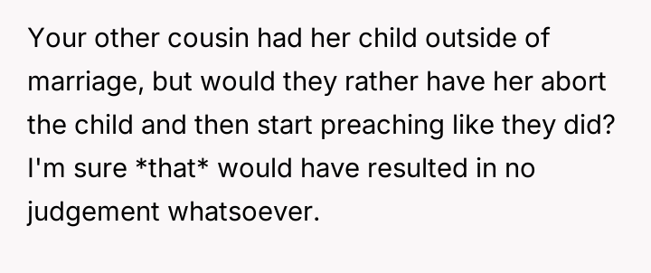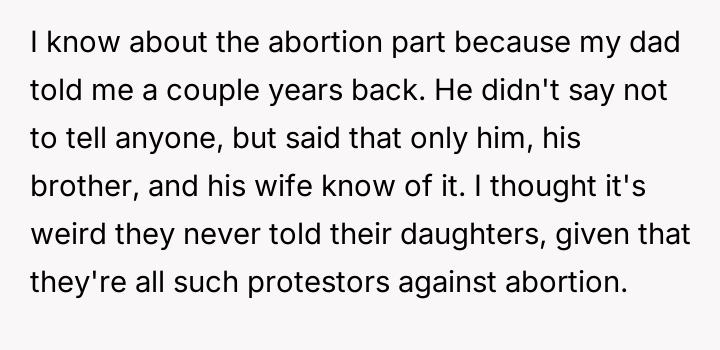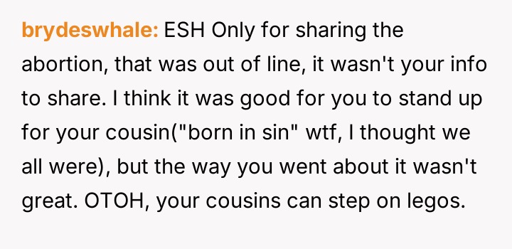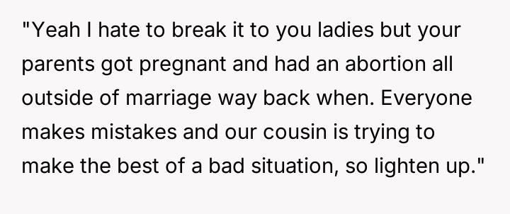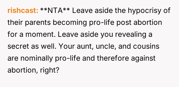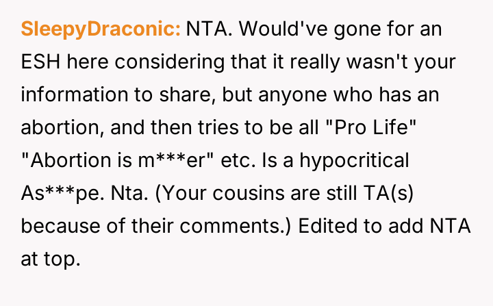 The original poster (OP) acted out of a desire to defend their cousin against harsh judgment from their cousins, revealing a sensitive family secret about an abortion to counter the hypocrisy they perceived.