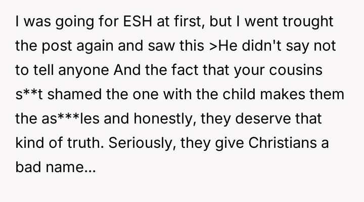 The original poster (OP) acted out of a desire to defend their cousin against harsh judgment from their cousins, revealing a sensitive family secret about an abortion to counter the hypocrisy they perceived.