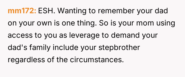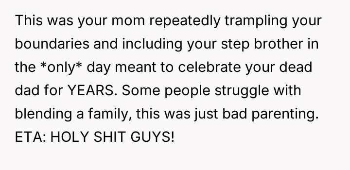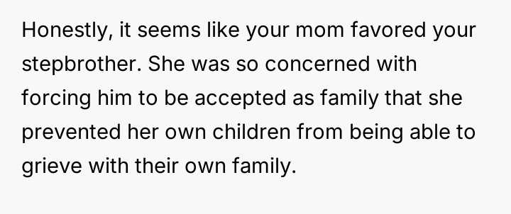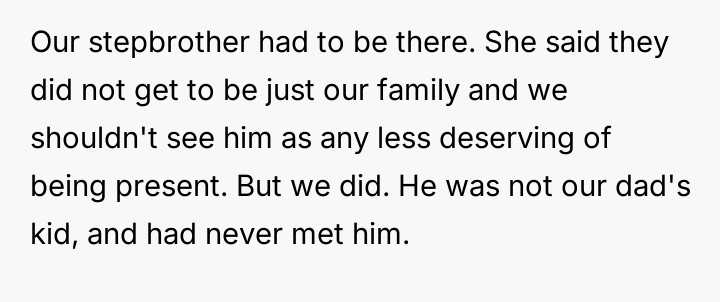 The central conflict revolves around the OP's mother enforcing unconditional inclusion of the stepbrother in family milestones related to the OP's deceased father, which the OP and sister felt was inappropriate given the stepbrother's lack of relationship with their father.