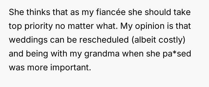 Was the OP correct in postponing the wedding to remain with his dying grandmother, knowing the emotional and financial impact on his fiancée, or did the prior commitment to the wedding and his fiancée's expectation of being the top priority override the need to be present at his grandmother's bedside?