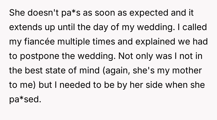 The original poster (OP) prioritized being present for the passing of his grandmother, whom he considers his true mother, over proceeding with his scheduled wedding day.