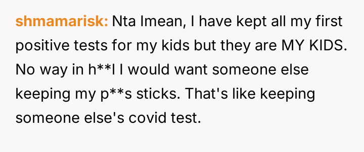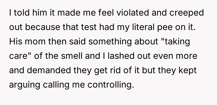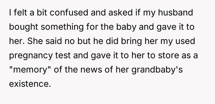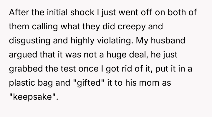 The original poster experienced extreme discomfort and felt violated when her husband gifted her used pregnancy test to his mother as a keepsake.