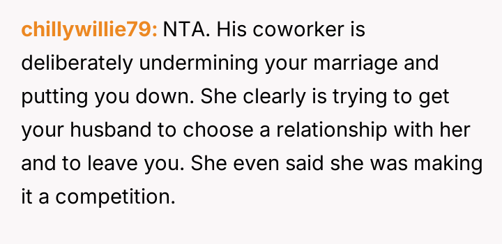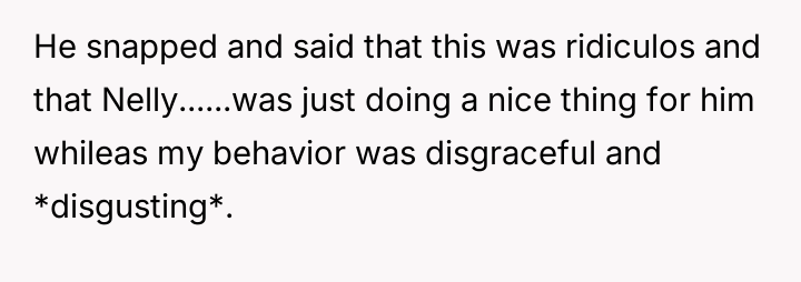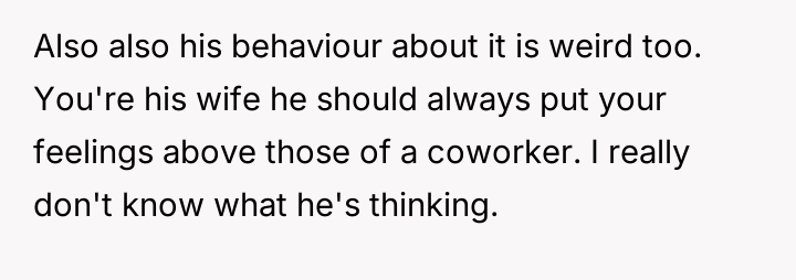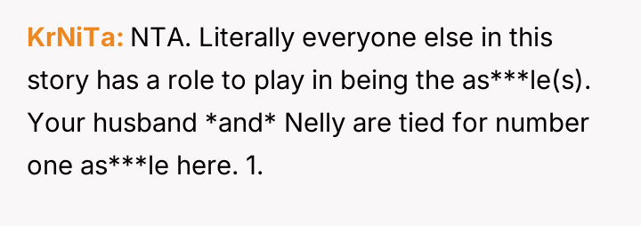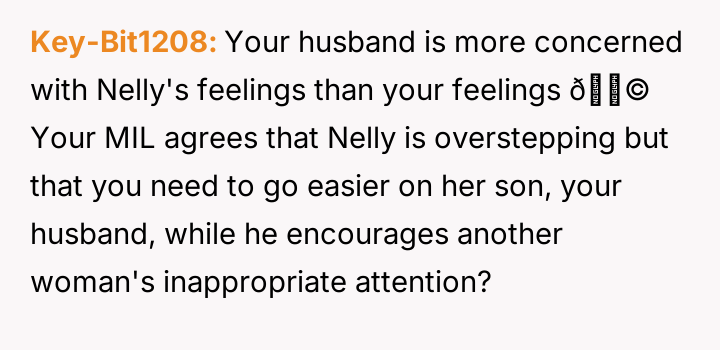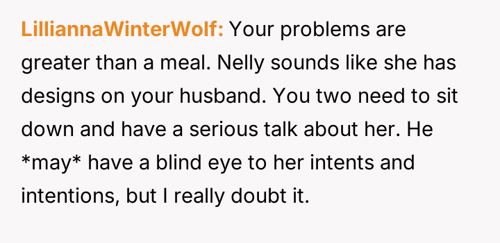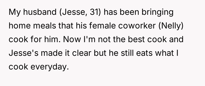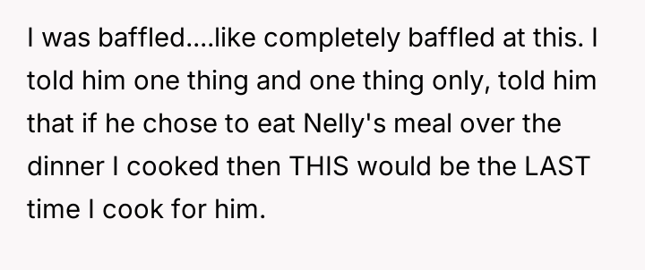 The original poster (OP) felt deeply disrespected by her husband's acceptance of negative comments about her cooking from a coworker, Nelly, and by his choice to prioritize a meal made by Nelly over the one the OP had prepared.
