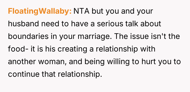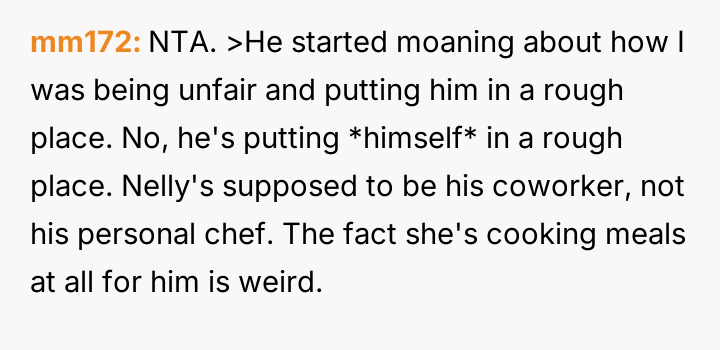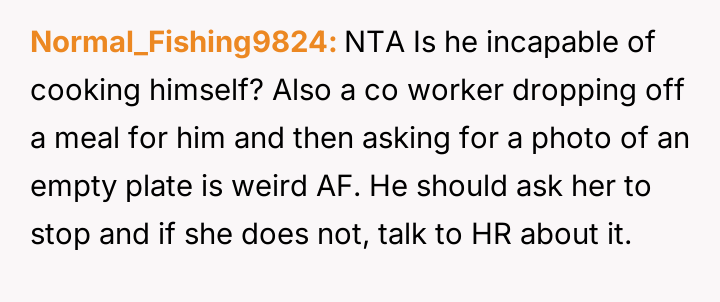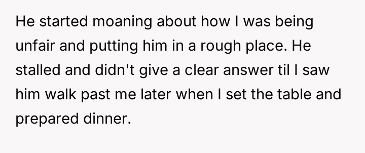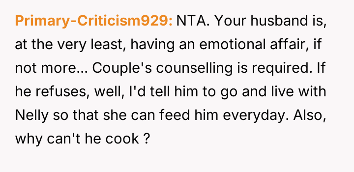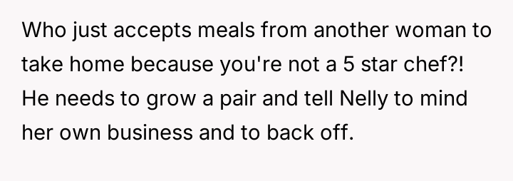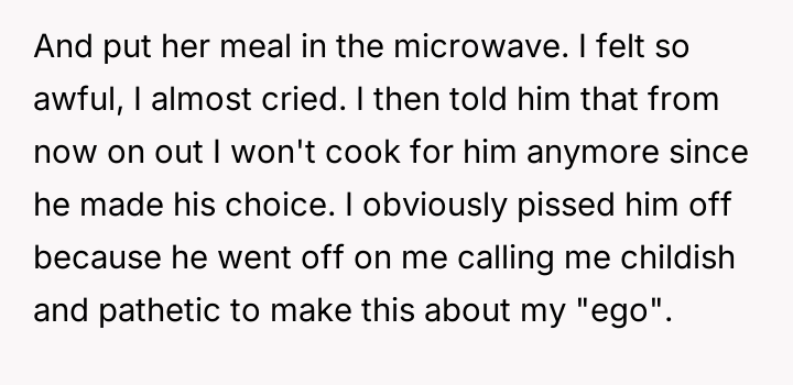 This led the OP to declare she would stop cooking for him, which the husband interpreted as an unfair and childish reaction driven by ego.