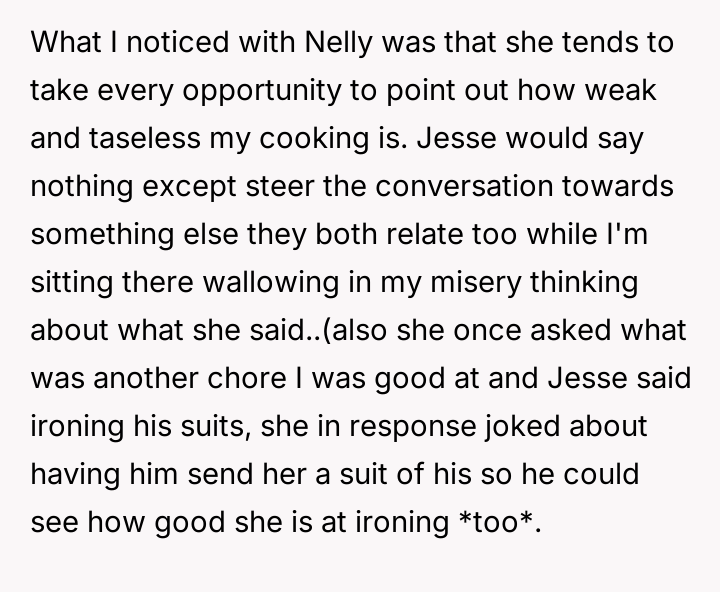 Her husband, Jesse, seemed to silently accept the sharp criticisms of his coworker Nelly, who not only belittled her cooking but also tried to insinuate herself into their domestic life with unsettling familiarity.