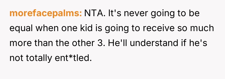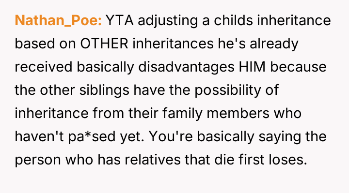 The central conflict arises because the OP's brother views this distribution as a symbolic slight against his son, demanding equal treatment despite the son's substantial existing inheritance from other sources.
