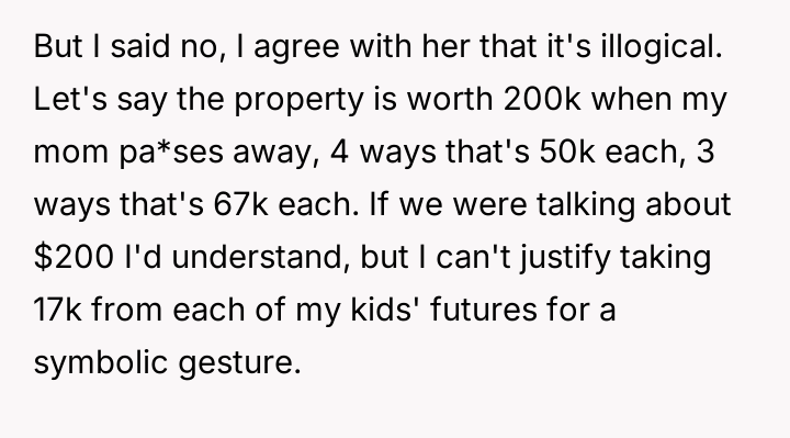 Is the OP mercenary for prioritizing a larger, practical financial benefit for their own children over participating in a symbolic gesture intended to ensure equal recognition for their brother's son?