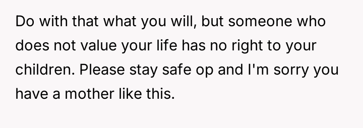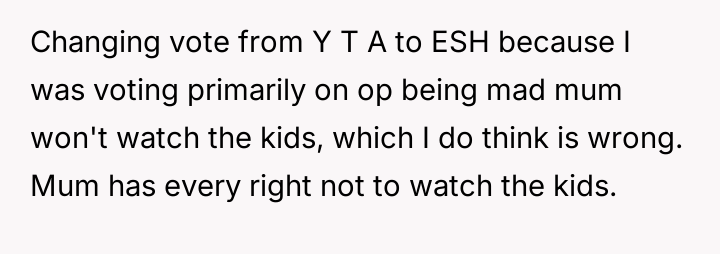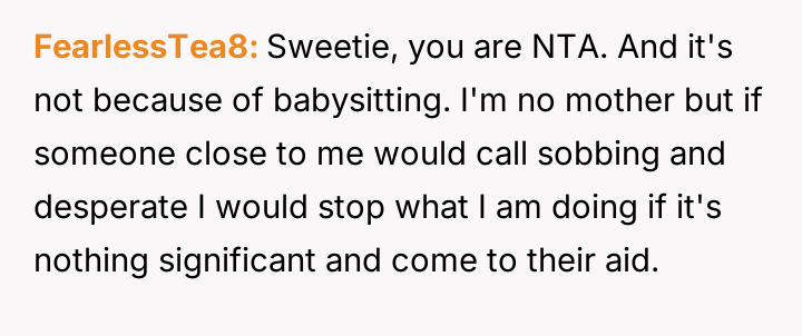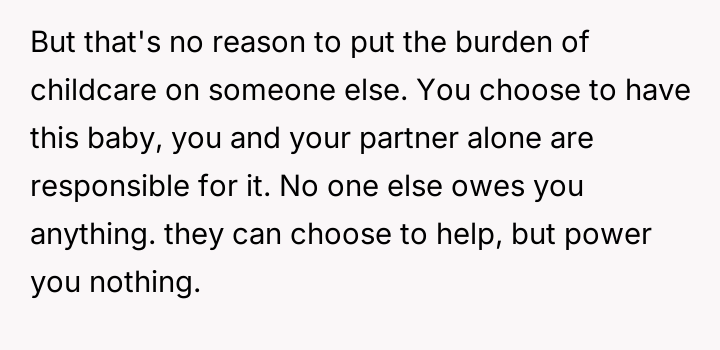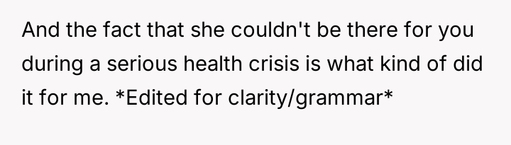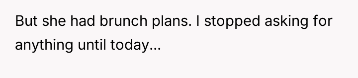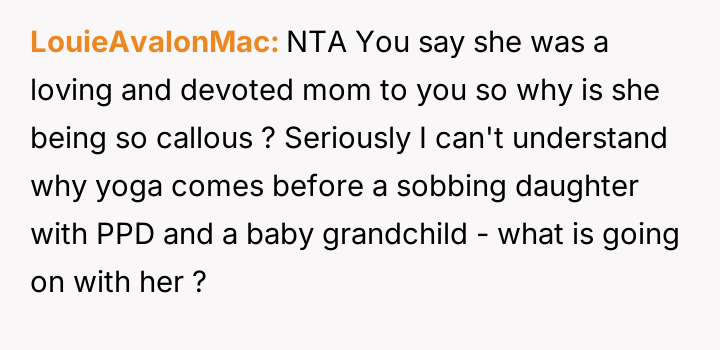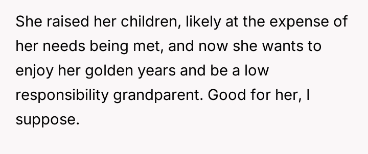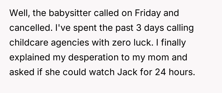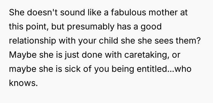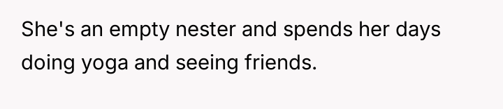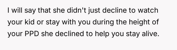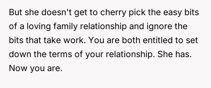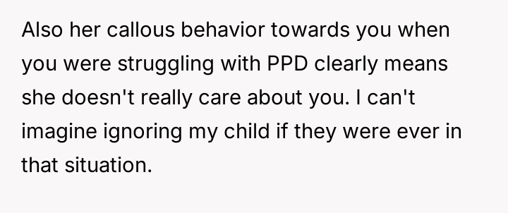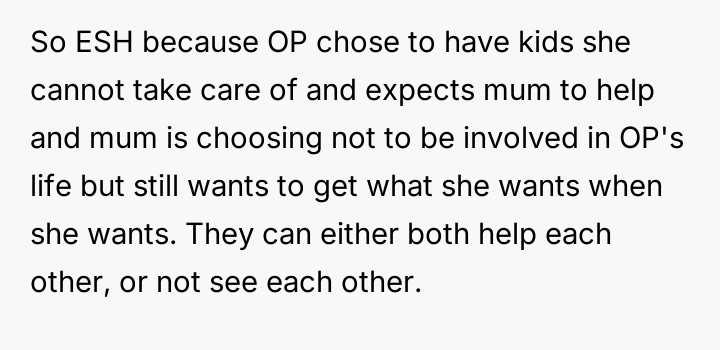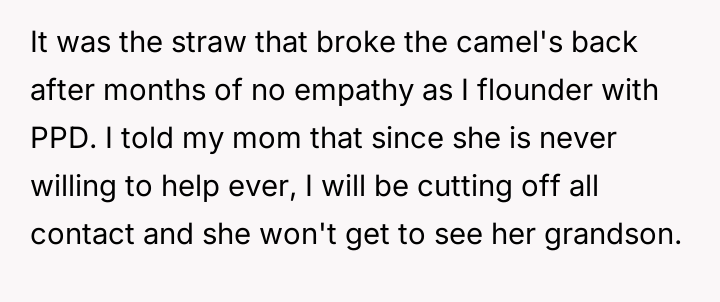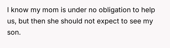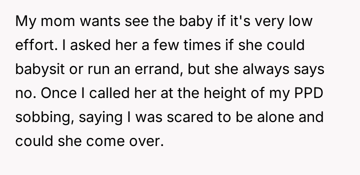 Her central conflict is the perceived lack of support from her own mother, leading her to sever contact as a consequence of her mother's consistent refusal to assist with childcare, even in a crisis.