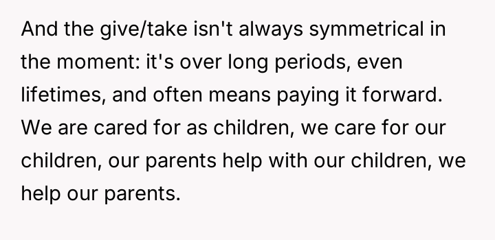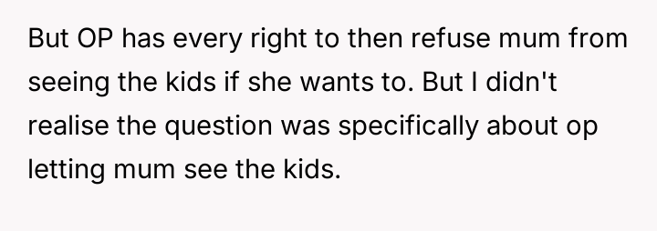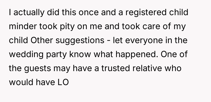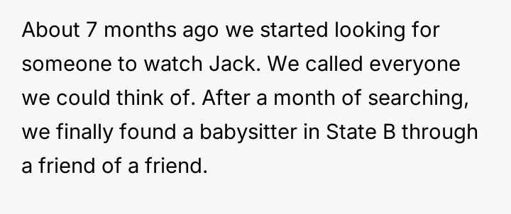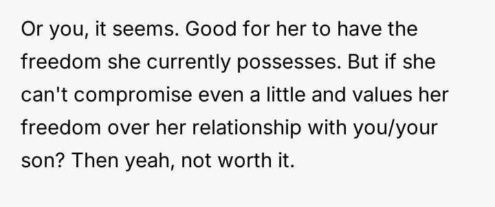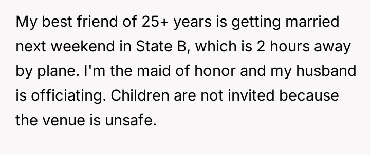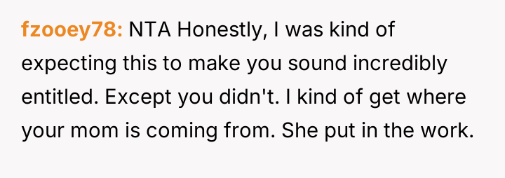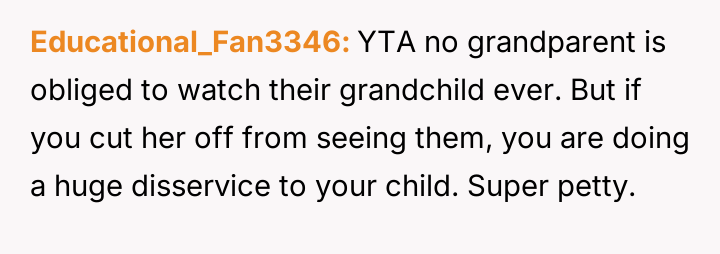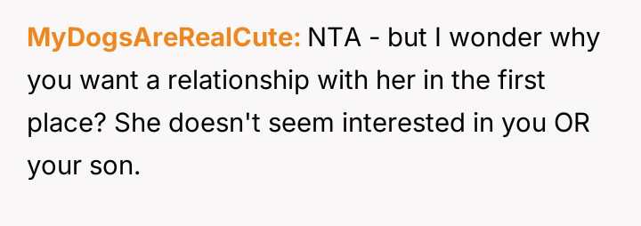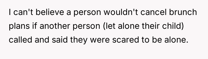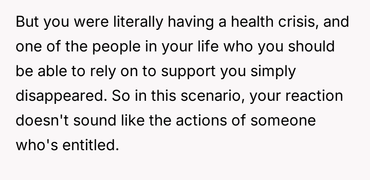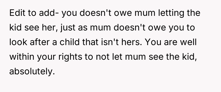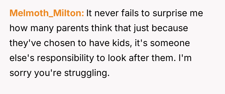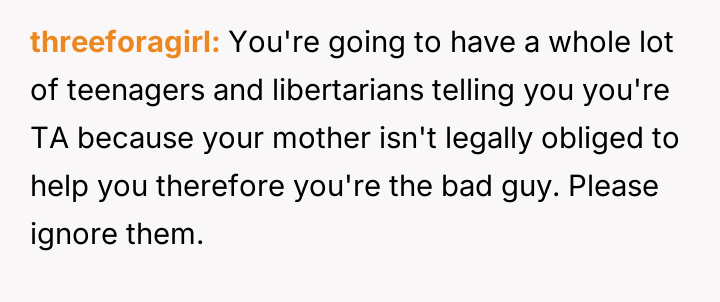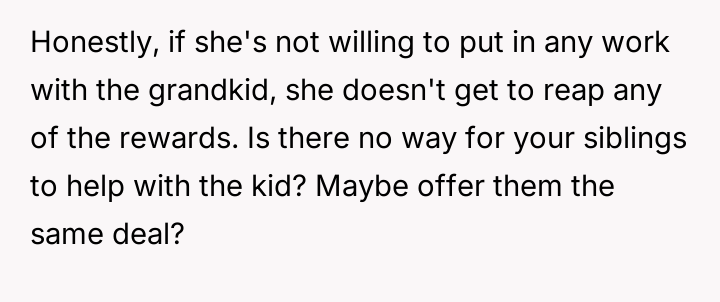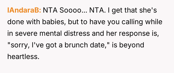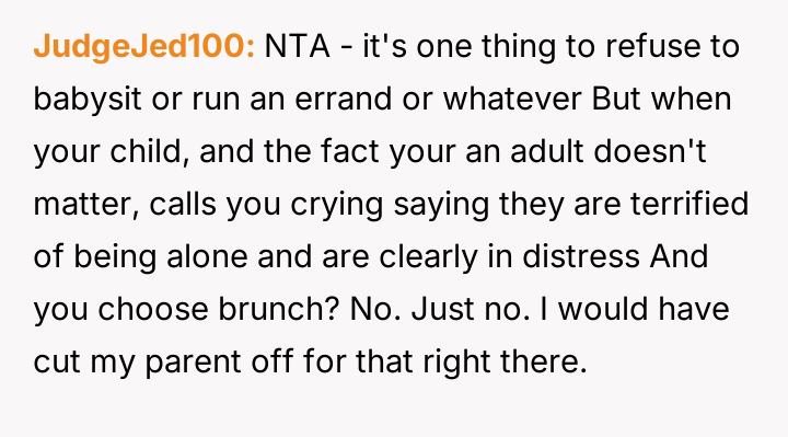 Her central conflict is the perceived lack of support from her own mother, leading her to sever contact as a consequence of her mother's consistent refusal to assist with childcare, even in a crisis.