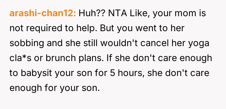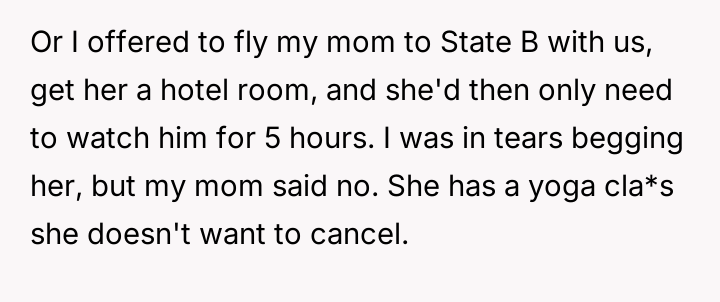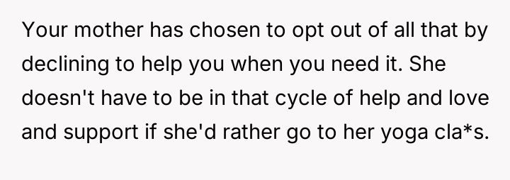 Given the OP's critical need for support versus her mother's stated preference for personal leisure, is it justifiable for the OP to enforce a complete communication boundary to prioritize her immediate family's well-being and signal the seriousness of her unmet needs?