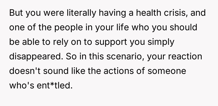 Her central conflict is the perceived lack of support from her own mother, leading her to sever contact as a consequence of her mother's consistent refusal to assist with childcare, even in a crisis.